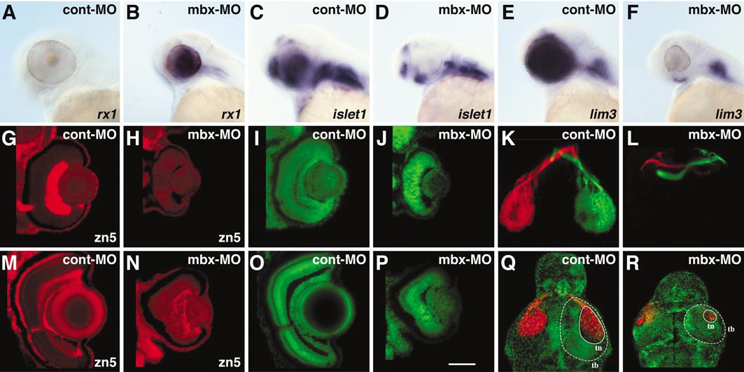 Fig. 5 Visual system phenotype in mbx-MO-injected embryos. (A–D) Expression patterns of retinal markers at 48 hpf. The expression of rx1 in retina is down-regulated in cont-MO-injected (A), but retained in mbx-MO-injected embryos (B). Islet1 and lim3 are activated in the retina of cont-MO-injected (C, E) but not mbx-MO-injected embryos (D, F); in contrast, expression of both genes in the hindbrain is not affected (D, F). (G–J, M–P) Retinal phenotype at 48 hpf (G–J) and 5 dpf (M–P). The number of RGCs and retinal axons, as visualized by zn-5 immunostaining, is greatly reduced in mbx-MO-injected embryos (H, N) compared with controls (G, M). (G) and (H) are shown at the same brightness setting to illustrate the absence of signal in (H). Nuclear staining using SYTOX (green) shows that retinal lamination is disorganized in mbx-MO-injected embryos (I, J, O, P). (K, L, Q, R) Retinotectal projections at 5 dpf. For clarity, the labeled eyes have been digitally removed. (K, L) The right and left eyes were labeled with diI (red) and diO (green), respectively. The number of retinal axons is greatly reduced in mbx-MO-injected embryos (L), but the remaining axons project normally to the contralateral side. (Q, R) Both eyes were labeled with diD (red), and the embryo was stained with SYTOX (green), which outlines the tectal border (tb) but does not label the cell-sparse tectal neuropil (tn). The size of the tecta, and especially the neuropil, was reduced in mbx-MO-injected embryos (R)