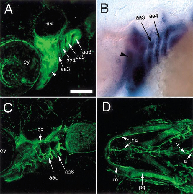 Fig. 3 EGFP expression in cranial neural crest derivatives in TG(fli1:EGFP)y1; albb4 embryos. (A–C) Lateral views, anterior is to the left, dorsal is up. (A) Live 2-dpf embryo expressing EGFP within the aortic arches (aa3–6aa, arrows) and the mesenchyme of the forming jaw (arrowhead); ey, eye; ea, ear. (B) Whole-mount in situ hybridization of endogenous fli1 transcript showing expression within aortic arches (arrows) and jaw primordium (arrowhead, out of focal plane). (C) Live 7-dpf larva showing EGFP expression in structures such as the parachordal cartilage (pc) as well as the vessels within the gills arches (aa5 and aa6; white arrow). EGFP expression is also apparent in the mesenchyme of the developing fin bud (f). (D) Ventral view of embryo in (C); EGFP expression in cells of the forming the jaw, such as Meckel’s cartilage (m) and the palatoquadrate (pq), and associated vessels, such as the hypobranchial artery (ha) as well as the ventricle (v) and atrium (a) of the heart. Scale bar, 100 μm.