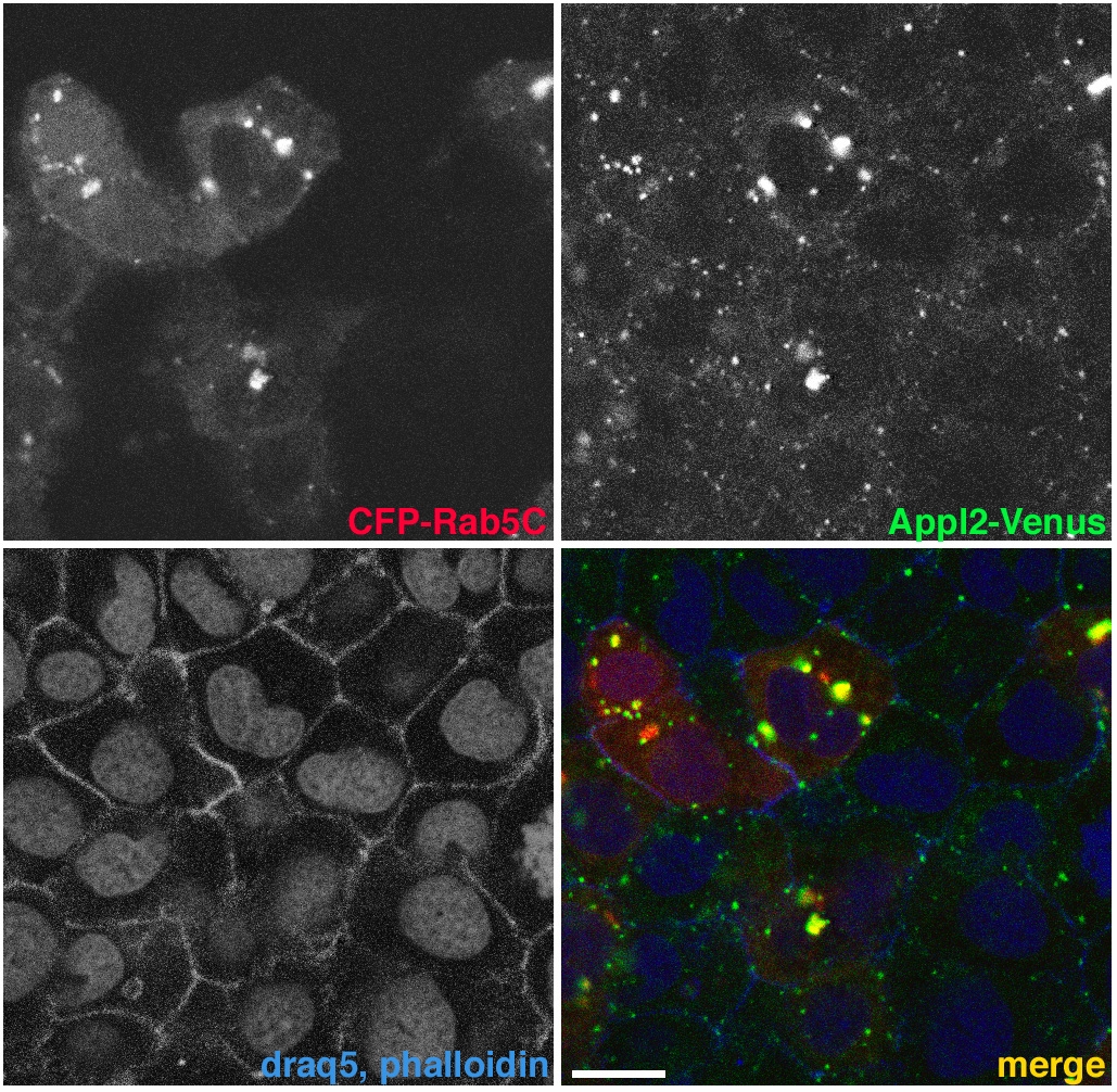Zebrafish embryos were injected with 100 pg appl2-Venus mRNA at 1 cell stage and with 50 pg CFP-Rab5C mRNA into single blastomeres at 16-cell stage, fixed and imaged at 50% epiboly stage. A single confocal section is shown, represented proteins are indicated. Draq5 and phalloidin staining highlight nuclei and cell margins. Note that the distribution of ubiquitously expressed Appl2-Venus is altered in all CFP-Rab5C co-expressing cells. Bigger and brighter structures are observed. Scale bar: 10 μm.