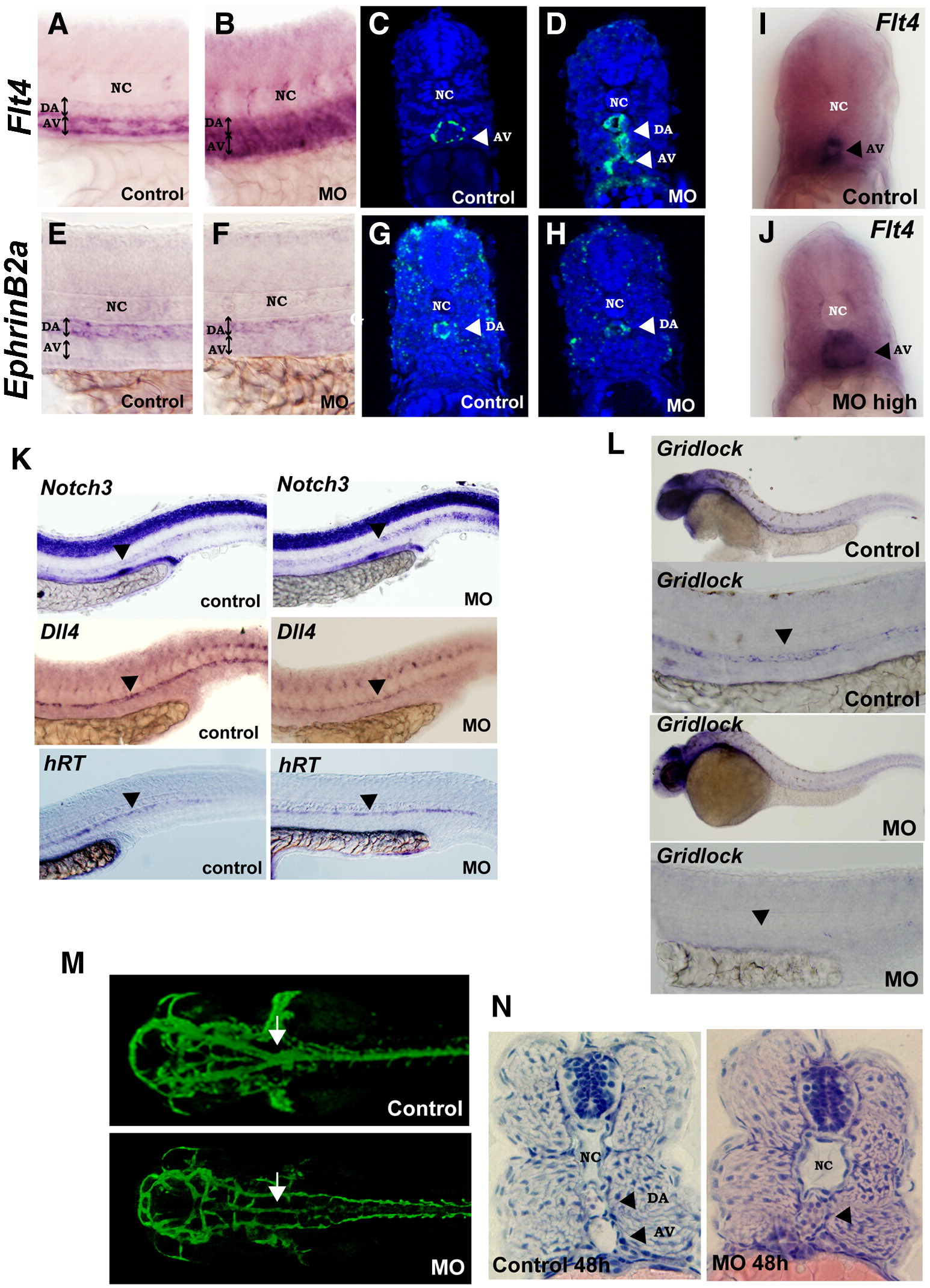 Fig. 4 Sox7/Sox18 morphants display abnormal arterial–venous specification and arteriovenous shunts. Except in panels I,J, all embryos shown resulted of injection of regular doses of control or Sox7/Sox18 morpholinos (4 ng of each) and are fixed at 28 hpf. Pictures and sections are made at the trunk level. (A–D) In situ staining with the venous-specific marker Flt4 shows an ectopic expression in the dorsal aorta while the domain corresponding to the artery-specific marker EphrinB2a (panels E–H) is reduced. Panels C,D,G,H are confocal images of transverse sections of fluorescent embryos labeled by in situ. (I,J) Transverse sections of embryos injected with high doses of Sox7/Sox18 morpholinos (6 ng of each). As revealed by Flt4 expression, the vein is widely expanded, at the expense of the artery. (K) Expression of the artery markers Notch3, hRT and Dll4 is not affected in double morphants. (L) There is an abolition of Gridlock expression in the double morphants within the aorta while its expression in the brain was not affected. (M) White arrows mark the proximal aorta at the level where the paired lateral dorsal aortae normally fused into a single tube. 28 hpf Tg(fli1:EGFP)Y1 control fishes show well differentiated proximal aorta whereas morphants display strong dysmorphogenesis of the proximal aorta. (N) Hematoxylin–eosin stained sections reveal arteriovenous shunts in the trunk region in Sox7/Sox18 morphants. NC = notochord; DA = dorsal aorta; AV = axial vein.