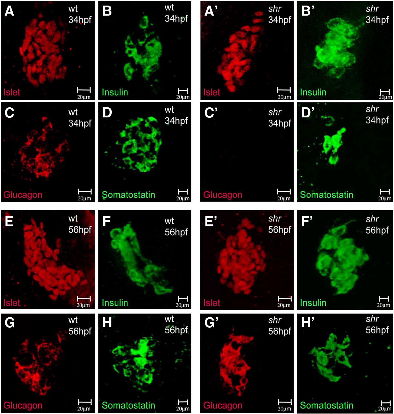 Fig. 2 shr is required for dorsal pancreas development. Confocal projections of wild-type and shrs435 mutant embryos at 34 (A–D′) and 56 (E–H′) hpf stained for Islet (red, A, A′, E, E′), Insulin (green, B, B′, F, F′), Glucagon (red, C, C′, G, G′), and Somatostatin (green, D, D′, H, H′) expression. The pancreatic expression of Islet and Insulin appears unaffected in shrs435 mutants at 34 and 56 hpf (A′, B′, E′, F′). The expression of Somatostatin appears reduced (D′) and that of Glucagon almost completely absent (C′) in shrs435 mutants at 34 hpf, but restored to wild-type levels by 56 hpf (G′, H′). All images are ventral views, anterior to the top.