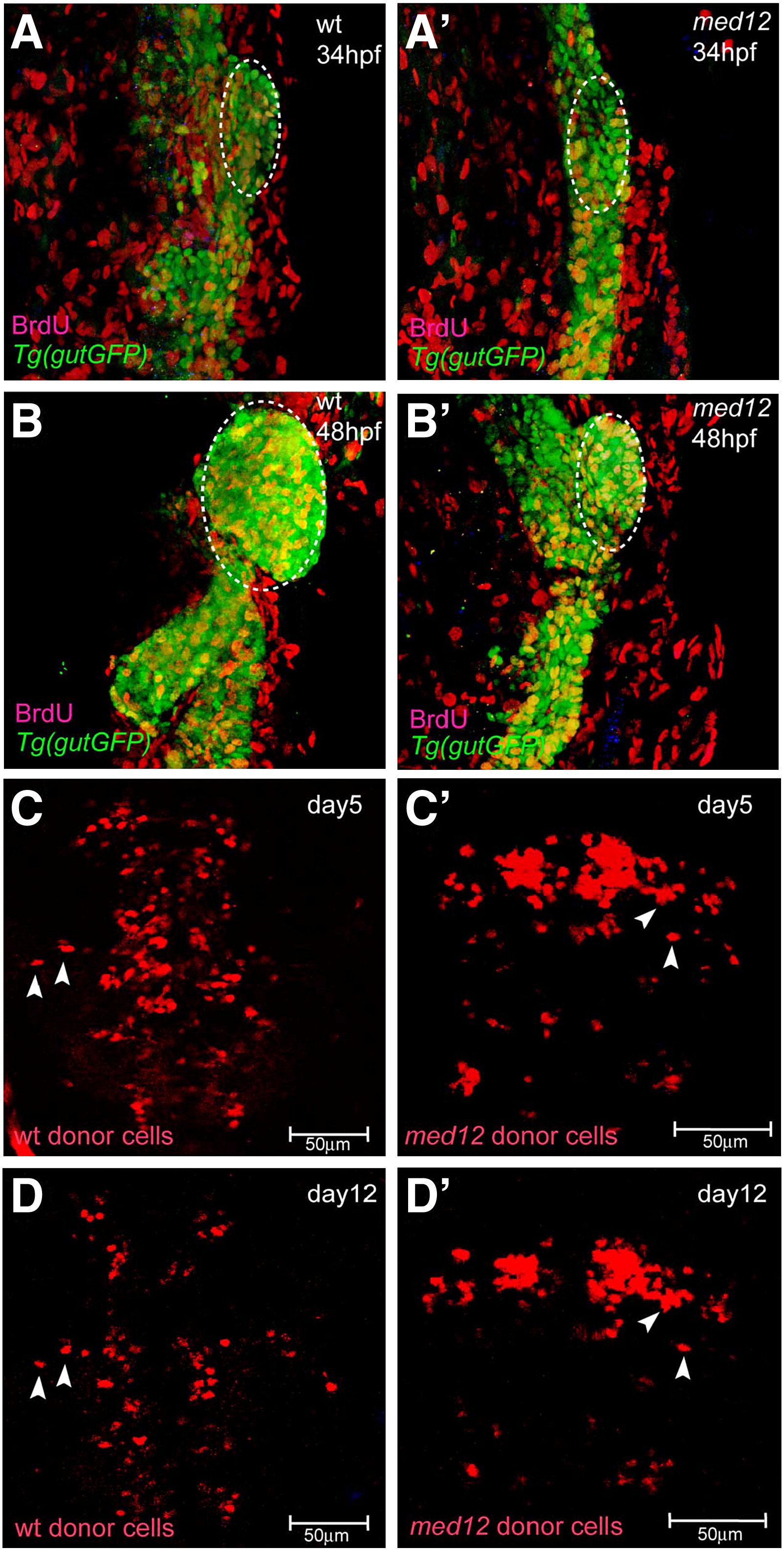 Fig. 4 Med12 does not appear to be essential for embryonic cell proliferation or viability. (A–B′) Confocal projections of wild-type and med12s435 mutant embryos in the Tg(gutGFP)s854 line (green) at 34 (A, A′) and 48 (B, B′) hpf in conjunction with BrdU (red) antibody staining. Yellow cells are endodermal cells (green) with BrdU (red) incorporation and white dashed lines surround the area used to count BrdU-positive cells. The overall level of endodermal BrdU incorporation in wild-type and med12s435mutant embryos appears similar (Table 1). (C–D′) Confocal projections of wild-type host embryos transplanted with wild-type (C, D) or med12s435 mutant (C′, D′) donor cells, visualized at days 5 (C, C′) and 12 (D, D′). Most wild-type and med12s435mutant donor cells survive until at least day 12 (D, D′). White arrowheads point to individual rhodamine dextran-labeled donor cells. The same embryo is shown in panels C and D, and another in panels C′ and D′. Images A–B′ are ventral views, anterior to the top; C–D′ are dorsal views, anterior to the top.
