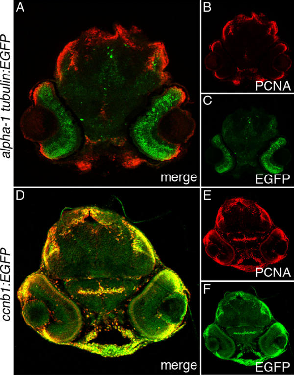 Fig. 7 Enhanced green fluorescent protein and proliferating cell nuclear antigen expression in Tg(1016α1tubulin:EGFP) and Tg(ccnb1:EGFP)nt18 72 hpf larva head sections. Enhanced green fluorescent protein (EGFP; C, F), proliferating cell nuclear antigen (PCNA; B, E), and merged expression patterns (A, D) are shown in 72 hpf larval head sections. In the Tg(1016α1tubulin:EGFP) zebrafish, EGFP was predominantly expressed throughout the retina, while PCNA was expressed in the retinal margin, mandibular tissue, the dorsal epithelium, and tectum (A-C). In the Tg(ccnb1:EGFP)nt18 zebrafish, EGFP was restricted to the retinal margins similar to PCNA, but EGFP was also expressed in other head tissues that coexpressed PCNA (D-F).
