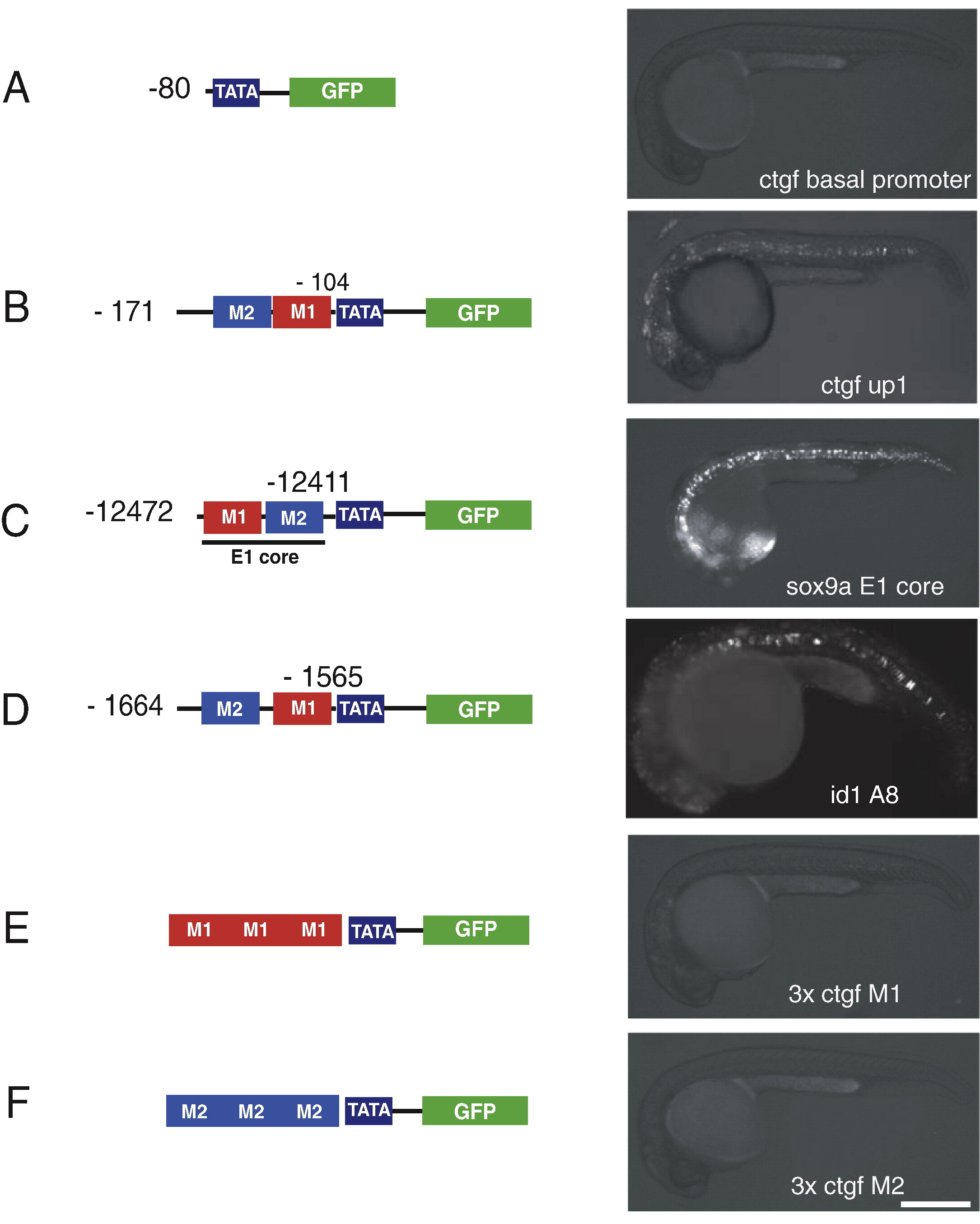 Fig. 7 Conserved M1 and M2 motifs are both required to drive gfp expression in the notochord. (A) Embryo injected with the gfp-reporter control, containing 80 bp of the ctgf basal promoter (TATA box). This promoter is inactive without addition of an upstream CRM. (B, C, D) gfp-reporter constructs under the control of M1 and M2 motifs from ctgf up1 (B), sox9a E1 (C) or id1 A8 (D) drive gfp expression in notochord cells. (E, F) Three copies of either the ctgf M1 motif (E) or of the ctgf M2 motif (F) are not sufficient for gfp-reporter expression, indicating that each of the elements alone is not sufficient and that the combination of the two elements specifies notochord expression. Embryos are 26 hpf old and are oriented anterior to the left and dorsal up. Numbers in the schematic drawing to the left indicate positions of fragments relative to the ATG of the respective linked gene. Scale bar = 250 μm.