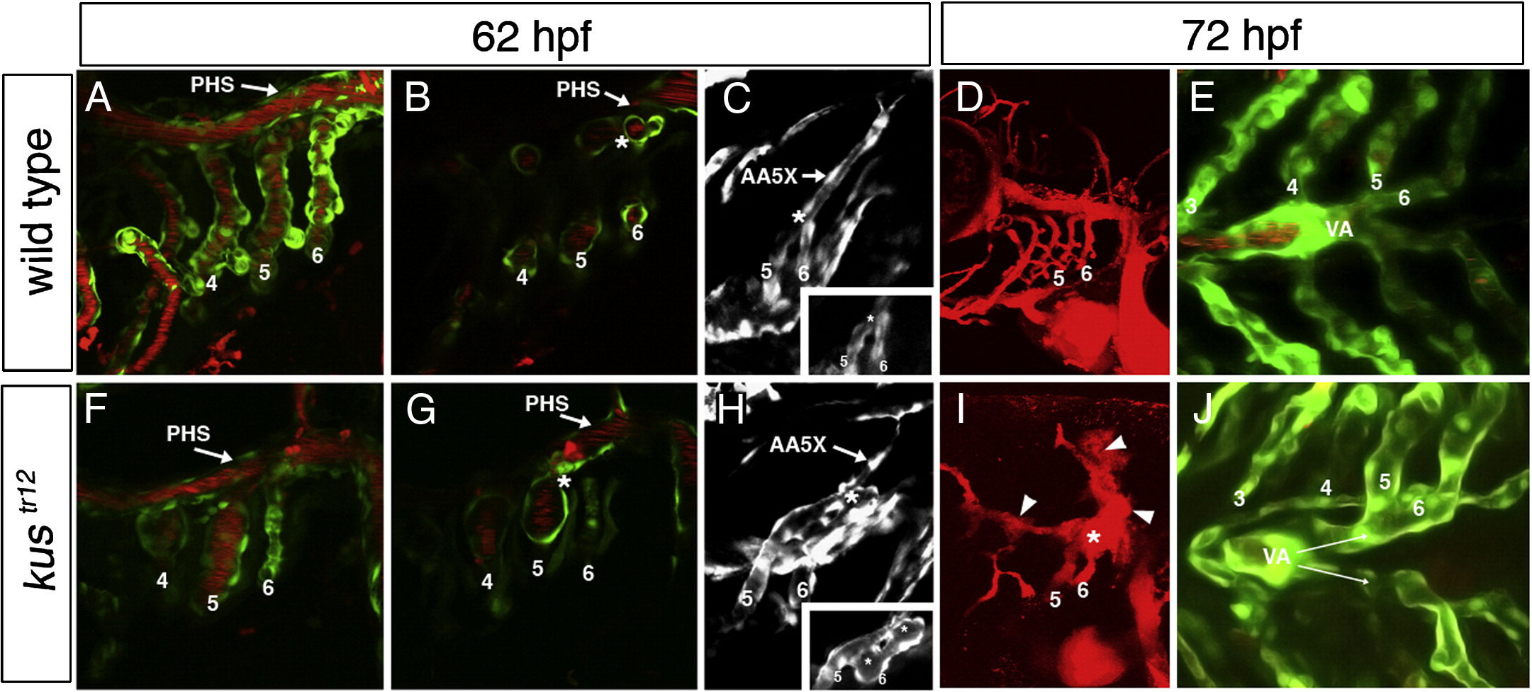 Fig. 3 Arteriovenous malformation and ventral aorta defect in kustr12 mutants. In wild type embryos, aortic arches 5 and 6 fuse just behind the primary head sinus (PHS) and connect to the lateral dorsal aorta via an extension of aortic arch 5 (AA5X); clear demarcation can be seen between the aortic arch 5/6 connection (asterisk) and the PHS (A–C). In contrast, in kustr12 mutants, AA5X is poorly formed, and the enlarged aortic arch 5/6 connection fuses to the adjacent PHS, creating an AVM (asterisk) that shunts blood directly back to the heart (F–H). This AVM carries the majority of blood flow and is typically associated with localized hemorrhage [arrowheads; compare D (WT) to I (kustr12)]. In wild type embryos, the paired ventral aortae (VA) fuse by 72 hpf (E). In contrast, in kustr12, the ventral aortae fail to fuse properly and remain paired at 72 hpf, similar to wild types at 48 hpf (J; compare also to Fig. 1M). 2D confocal projections of TG(flk1:GFPla116;gata1:dsRed) embryos (A, E, F, J); TG(flk1:GFPla116) embryos (C, H); or microangiograms (D, I). Panels B, G and insets in panels C, H are single planes from confocal Z-stacks represented by A, F, C, and H, respectively. A–C; F–H: 62 hpf. D, E, I, J: 72 hpf. A, B, D, F, G, I: lateral views, anterior to the left. C, H: dorsolateral views, anterior to the left. E, J: ventral views, anterior to the left.