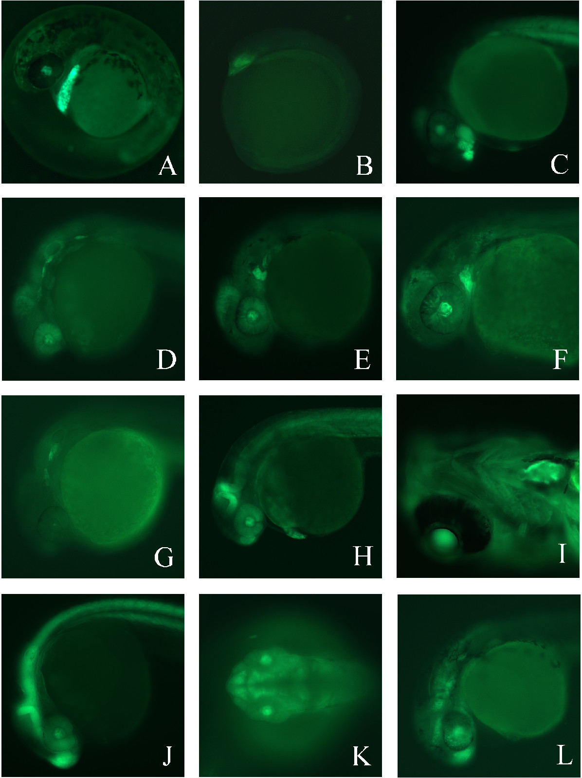 Fig. 3 Enhancer trap lines exhibit a variety of unique GFP expression patterns. (A). Lateral view of GFP expression in Enhancer Trap line 1 (ET1) at 38 hours post fertilization (hpf). (B) ET3 at 5–6 somite stage. (C) ET3 at 36 hpf. (D) ET4 at 26 hpf. (E) ET5 at 30 hpf. (F) ET5 at 48 hpf. (G) ET6 at 26 hpf. (H) ET7 at 32 hpf. (I) Ventral view of ET7 at 5 dpf. (J) Lateral view of ET8 at 26 hpf. (K) Dorsal view of ET9 at 28 hpf. (L) Lateral view of ET9 at 30 hpf. In all panels, anterior is to the left. See text for details.