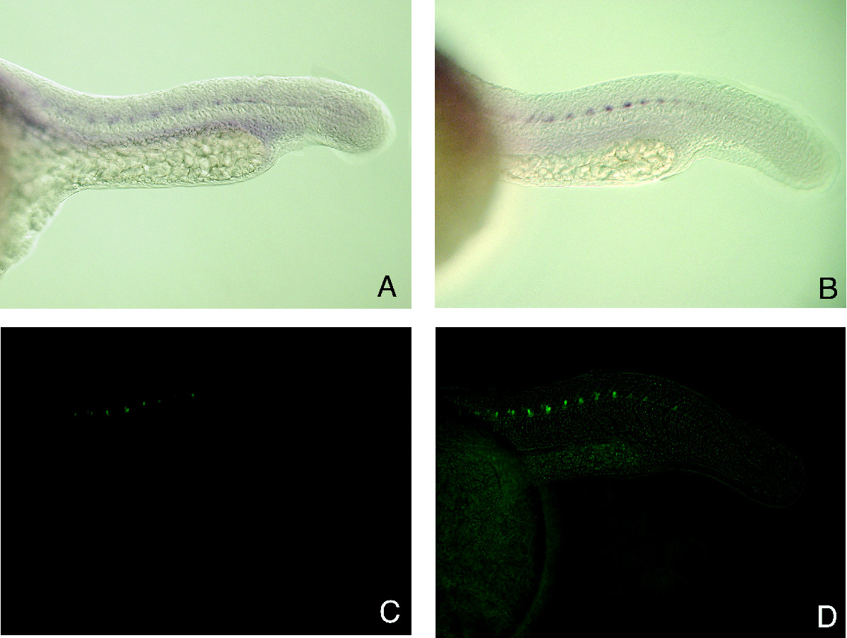 Fig. 6 GFP expression in ET2 line embryos is indistinguishable from endogenous PARG gene expression. 23 hpf embryos collected from a heterozygous outcross were photographed for GFP fluorescence and sibling embryos were fixed for in situ hybridization. (A) In situ hybridization with PARG antisense probe. (B) In situ with GFP antisense probe. (C) Visualization of GFP expression in living embryos using a bandpass GFP filter set. (D) The same embryo as in (C) photographed using a bandpass GFP filter set with a low level of bright field illumination to visualize GFP expression in relative position to the somites.