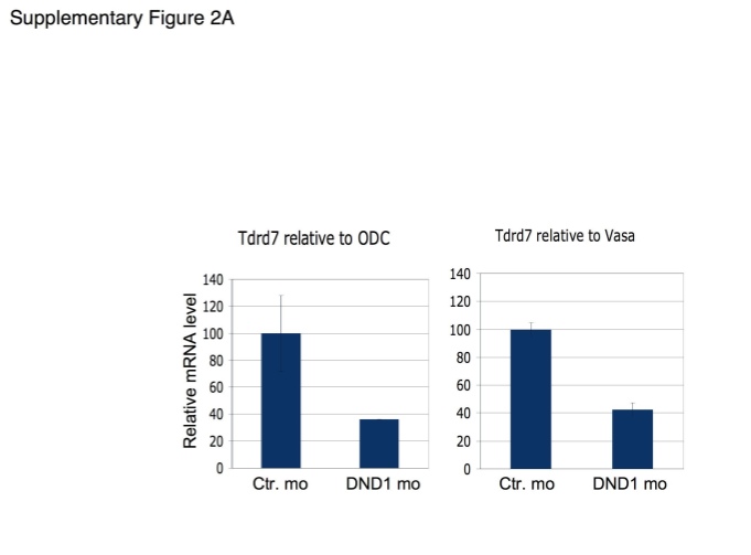 (A) One-cell-stage zebrafish embryos were injected with dead end morpholino or control morpholino. RNA was extracted and subjected to Q- RTPCR analysis to compare endogenous levels of TDRD7 and Vasa to Odc, and TDRD7 to Vasa.