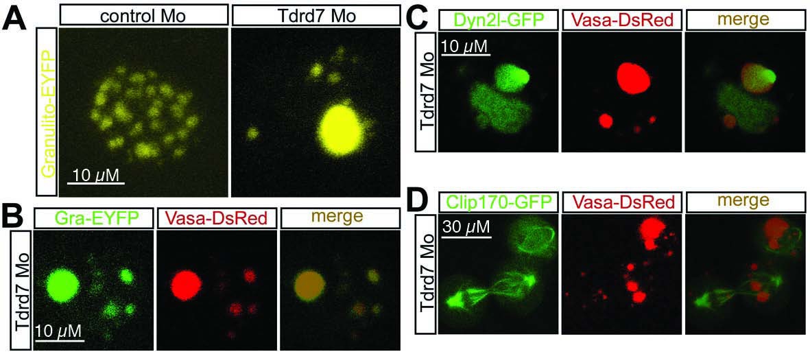 Fig. S8 Verification of the Tdrd7 knock down phenotype. A) 3D projection of granules labeled with Granulito-EYFP in 24 hours old control cells (left panel), in Tdrd7 depleted cells (right panel) verifies that Tdrd7 function is indeed required for the formation of uniform normal sized granules. B) Granulito and Vasa colocalize as well in the Tdrd7 morphant situation with each other. C) Coexpression of the GFP fusion to dynein light chain2 and Vasa DsRed in Tdrd7 morphant PGCs shows a comparable dynamic localization of Dynein in germ cell granules as it is known for wildtype PGCs. D) Using Clip170-GFP as a marker for microtubular networks shows normal network for interphase as well as mitotic PGCs.