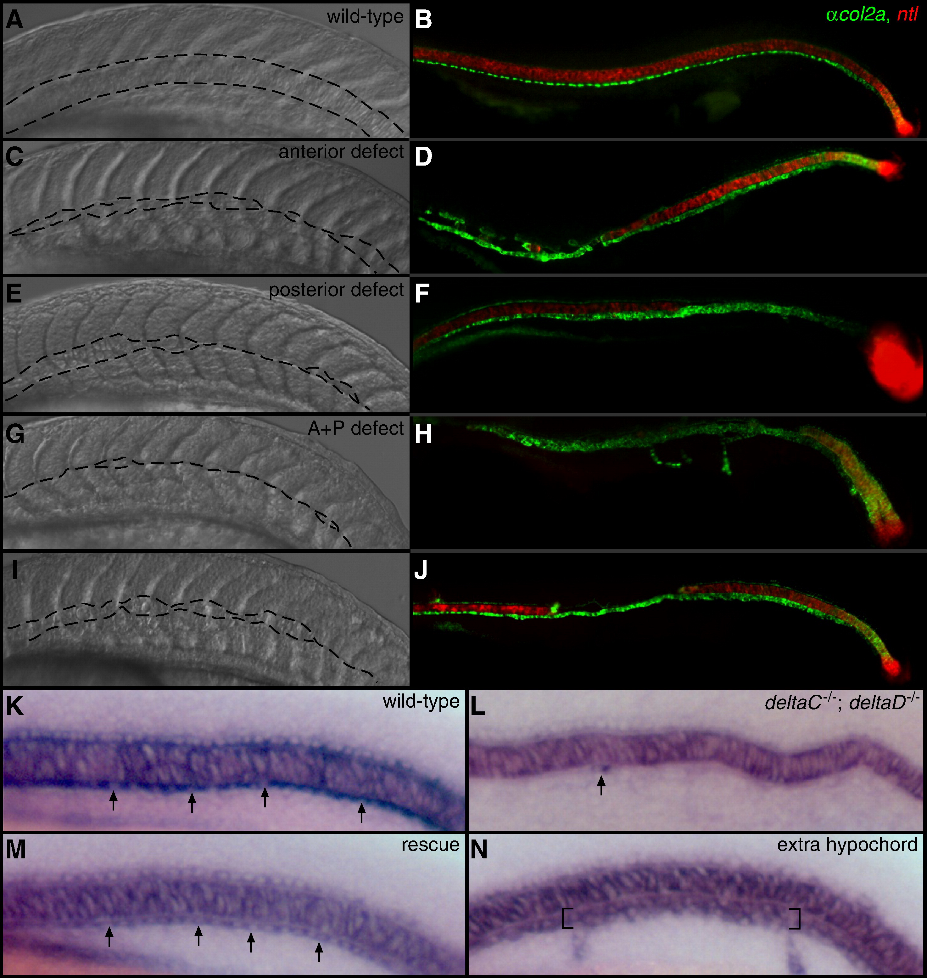 Fig. 3 Over-expression of different deltas promotes hypochord cell fates over notochord at distinct positions along the anterior–posterior axis. (A–J) DIC and fluorescent in situ images of embryos with notochord to hypochord conversions at different positions along the anterior–posterior axis. DIC images are at 24 somites, while in situ images are at 24 hpf. ntl expression (red) marks the notochord, while αcol2a (green) shows the floor plate and hypochord. Embryos lacking notochord entirely are present, but have a twisted body axis and cannot be imaged easily via fluorescence, hence a weaker phenotype with some residual ntl expression is shown in (H). (K–M) Embryos at the 24 somite stage stained for αcol2a. Injection of some delta mRNAs can rescue hypochord formation in embryos where both deltaC and deltaD function have been impaired (i.e. deltaC-/- embryos injected with a deltaD morpholino). Select hypochord cells are marked by arrows or brackets.