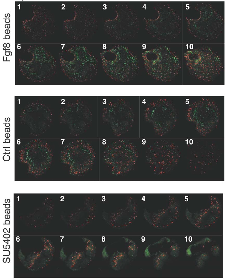 Fig. S4 A complete sequence of 10 consecutive confocal optical sections is shown for explants (Figure 1) exposed to beads soaked in Fgf8, PBS (control), and SU5402. Note the clear differences in the ratio between the numbers of differentiated cells (islet-1, green nuclei) versus proliferating cells (phospho-Histone 3, red nuclei) in those explants.