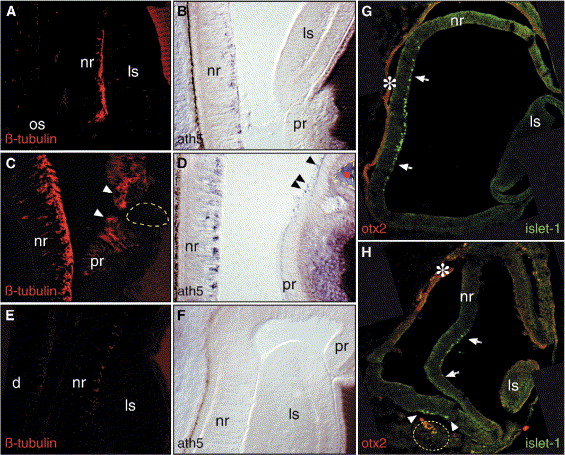 (A–H) (A, B, and G) Control, (C, D, and H) FGF8, and (E and F) SU5402 bead-implanted embryos were sectioned and stained for (A, C, and E) β-tubulin, (B, D, and F) ath5, (G and H) islet-1, and Otx2 (red, labeled with an asterisk in [G] and [H]). Note that in the peripheral retina both β-tubulin and Cath5 are induced in proximity to the implanted Fgf8 bead (arrowheads in [C] and [D]). (E and F) SU5402-soaked beads inhibit neuronal differentiation. Inhibition occurs even at long range; the SU5402-soaked bead implanted is not visible within the photographed field. When beads are implanted into the periocular mesenchyme close to the RPE, Fgf8 induces an additional center of neurogenesis (arrowheads in [H]). d, diencephalon; pr, peripheral retinal.