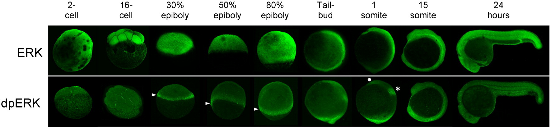 Fig. S1 Spatio-temporal distribution of global ERK protein, compared to active dual-phosphorylated ERK (dpERK) protein by immuno-histochemistry. DpERK signal was stronger on the cleavage-sites (2-cell and 16-cell stage). During gastrulation dpERK signal was enhanced in the margin (►). After completion of gastrulation stronger signals were observed in the tailbud, MHB (*) and the anterior neural boundary (●). (5x objective, Biorad confocal laser scanning microscope).