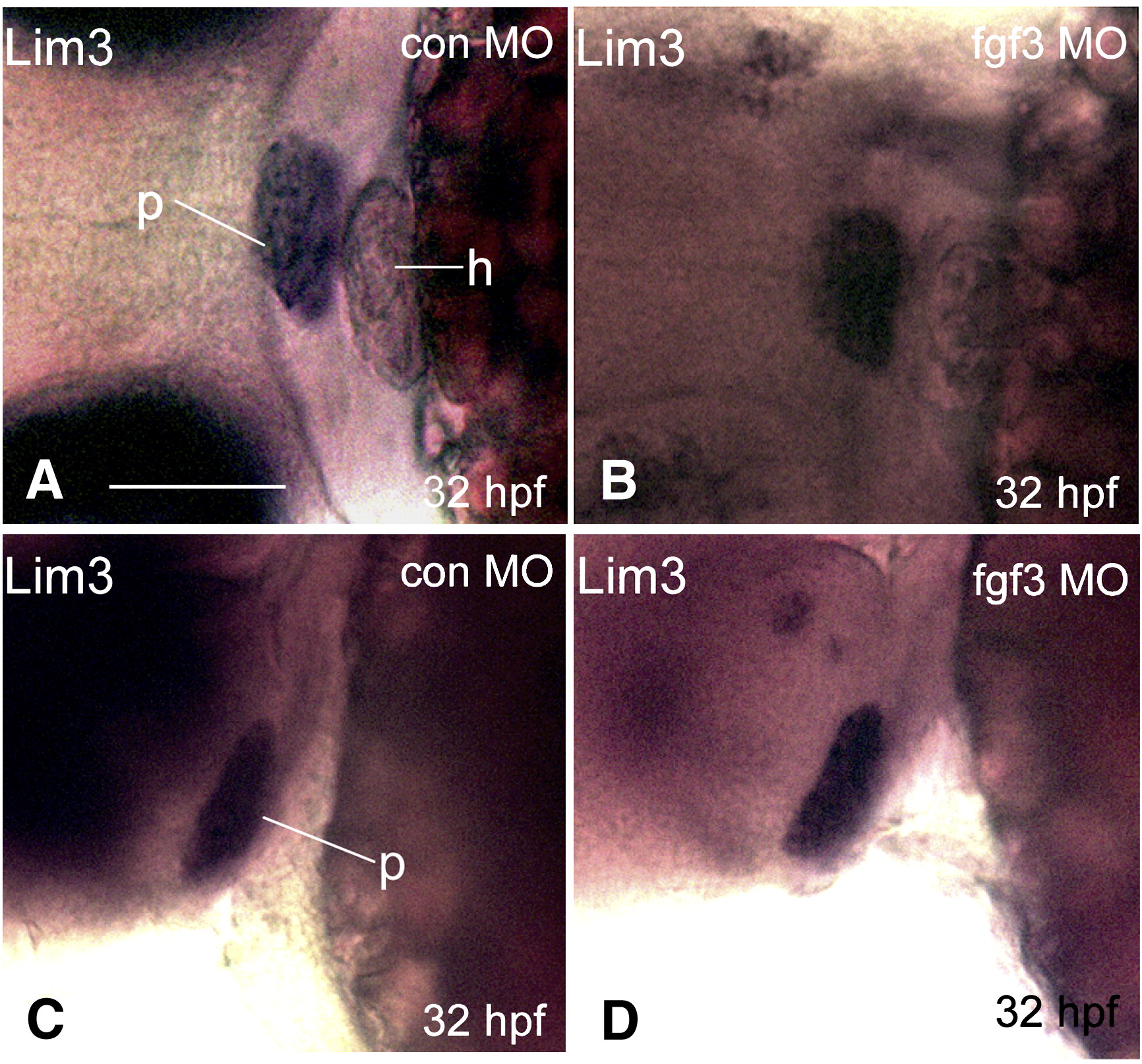 Fig. 6 Hypomorphic FGF3 morphants exhibit intact Lim3 expression at 32 hpf. 1–2 cell stage POMC-GFP transgenic embryos were injected with either 0.4 ng/embryo standard control MO (E and G) or FGF3 MO (F and H) and then cultured in routine medium. At 32 hpf, Lim3 in situ hybridization was performed. E and F: frontal view; left, top. G, H: lateral view; left, anterior; right, posterior. p, pituitary; h, heart. Scale bar, 50 μm.