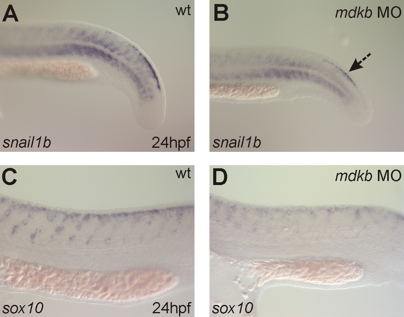 Fig. S3 Partial recovery of ncc in mdkb morphants at 24hpf. Expression of snail1b (A,B) and sox10 (C,D) in embryos injected with mdkb Morpholinos. Dashed arrow in B labels ncc in the tail.