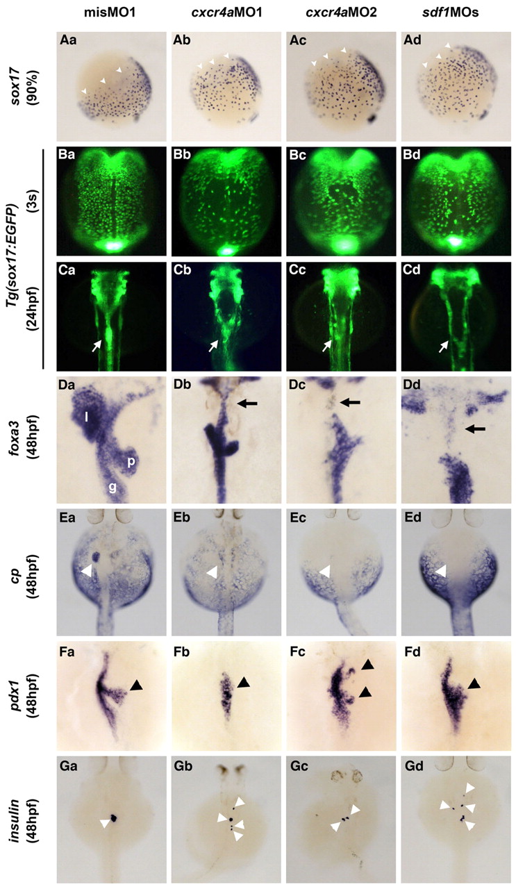 Fig. 2 Sdf1/Cxcr4a signaling controls the migration of endodermal cells during gastrulation. (Aa-Ad) sox17 expression was examined by whole-mount in situ hybridization in misMO1-, cxcr4aMO1-, cxcr4aMO2- or sdf1MOs-injected zebrafish embryos at the 90% epiboly (9 hpf) stage. Lateral views, dorsal to the right. The migration of sox17-expressing endodermal cells in the animal-lateral region to the dorsal midline is delayed in the cxcr4aMO1-, cxcr4aMO2- and sdf1MOs-injected embryos (arrowheads). (Ba-Bd) Dorsal views of the mid-trunk region of Tg(sox17:EGFP) transgenic embryos at the three-somite (3s) stage. Anterior is to the top. The migration of EGFP-positive endodermal cells to the dorsal midline is delayed by the knockdown of either cxcr4a or sdf1. (Ca-Cd) Dorsal views of the pharyngeal and foregut regions of Tg(sox17:EGFP) transgenic embryos at 24 hpf. Anterior is to the top. Both the cxcr4a and sdf1 knockdown embryos show a splitting of the anterior gut (arrows). (Da-Gd) The expression of foxa3 (gut and its associated organs), cp (liver), pdx1 (pancreas) and ins (β-cells in pancreas) was examined in misMO1-, cxcr4aMO1-, cxcr4aMO2- or sdf1MOs-injected embryos at 48 hpf. The expression of foxa3 in the anterior part of foregut is lost in both the cxcr4a and sdf1 knockdown embryos (arrows, Db-Dd). Moreover, the liver is not formed (arrowheads, Ea-Ed), the pancreas is small and is not assembled properly (arrowheads, Fa-Fd), and insulin-producing β-cells in the pancreas do not cluster (arrowheads, Ga-Gd) in both the cxcr4a and sdf1 knockdown embryos. l, liver; p, pancreas; g, gut. Note also that no phenotypic differences in endoderm migration and organ formation among the cxcr4aMO1-, cxcr4aMO2- and sdf1MOs-injected embryos can be observed.