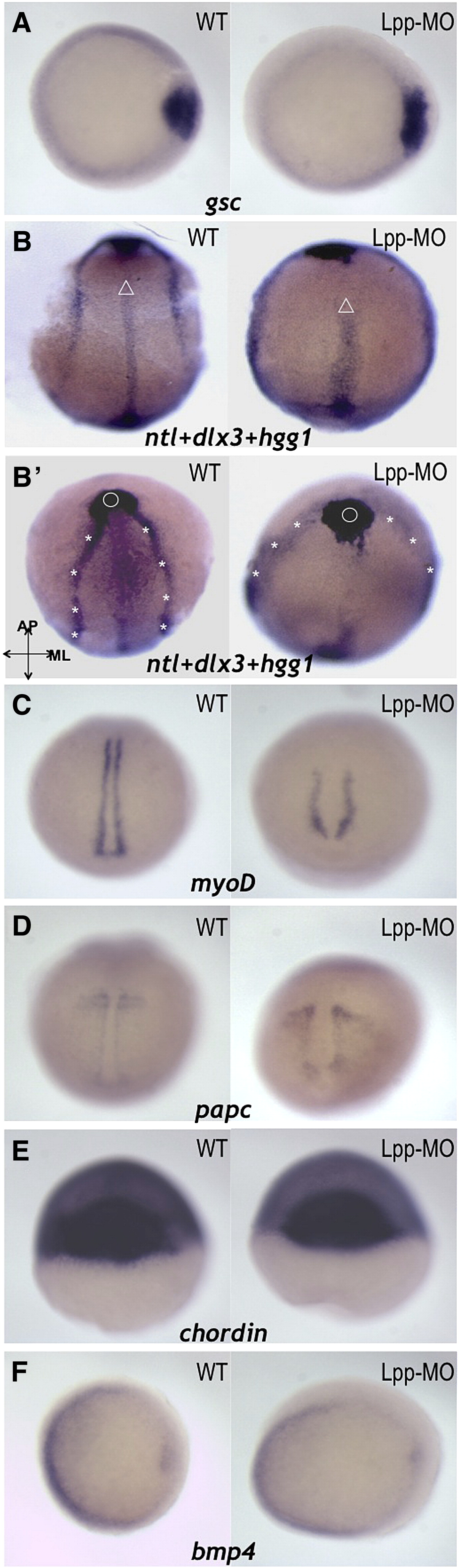 Fig. 3 Expression of marker genes in lpp morphants. Wild-type embryos and embryos injected with Lpp-morpholino were analyzed for the expression domains of marker genes by whole mount in situ hybridization. In each section (A–F), wild-type (WT) embryos are depicted on the left and lpp morphants (Lpp-MO) on the right. (A) gsc, shield stage, animal pole view, dorsal to the right. (B, B′) ntl (Δ), dlx-3 (∗) and hgg1 (O), tailbud stage, dorsal views (B) and animal pole views (B′) of the same embryo. (C) myoD, tailbud stage, dorsal view. (D) papc, two-somite stage, dorsal view. (E) chordin, shield stage, dorsal view. (F) bmp4, shield stage, animal pole view, dorsal to the right.