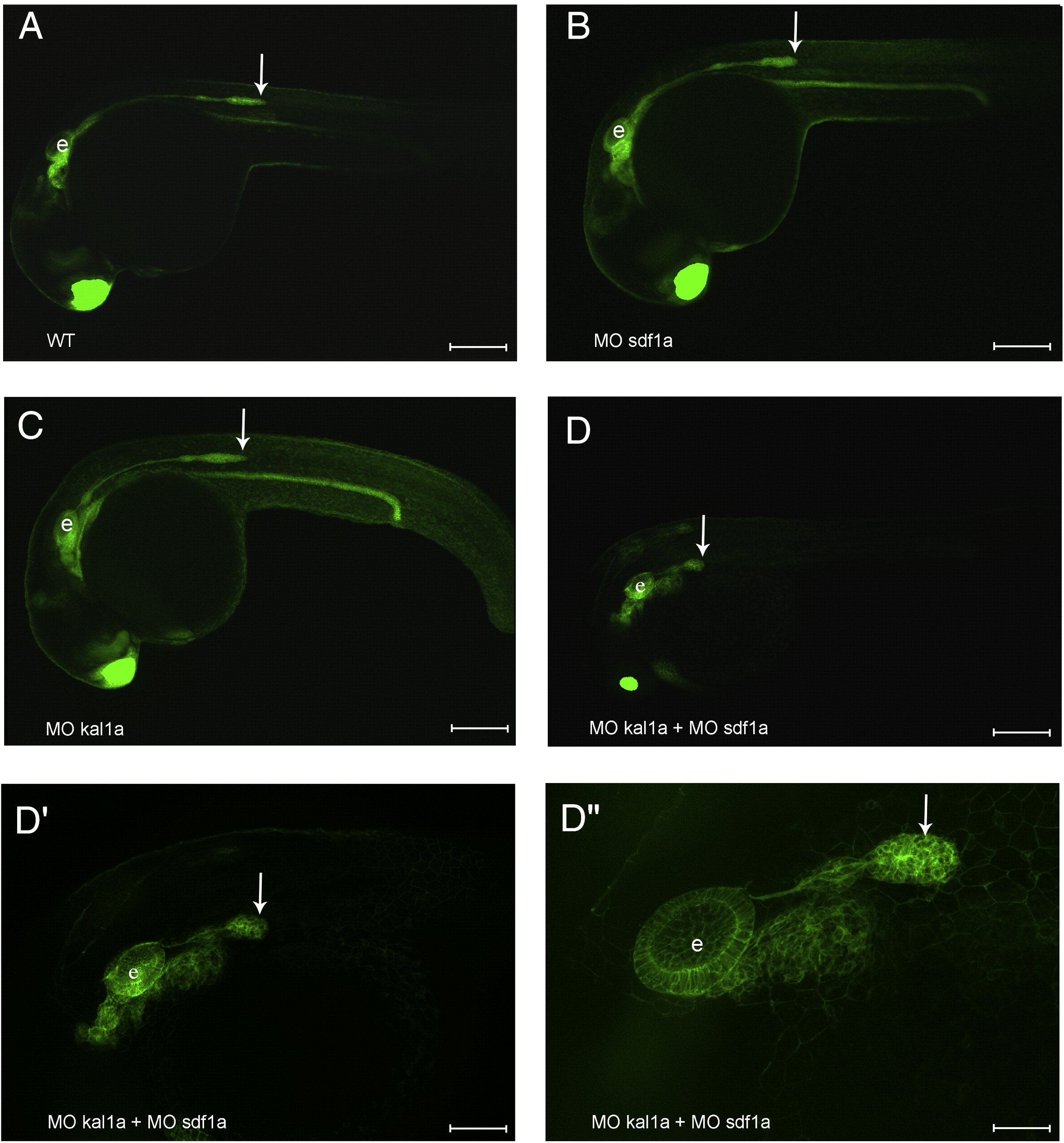 Fig. 7 Moderate depletion of both anosmin-1a and SDF1a markedly affects PLLP migration. 26 hpf ClaudinB::GFP embryo (A) and ClaudinB::GFP embryos injected with MO sdf1a (0.1 mM) (B), MO kal1a (0.1 mM) (C) or co-injected with a mix of MO sdf1a and MO kal1a (0.1 mM each) (D). Magnified views the primordium of the embryo shown in panel D (D′ and D″). Arrows indicate the PLLP. e: ear. Scale bar = 200 ′m in panels A–C, 300 ′m in panel D, 100 μm in panel D′ and 50 μm in panel D″.