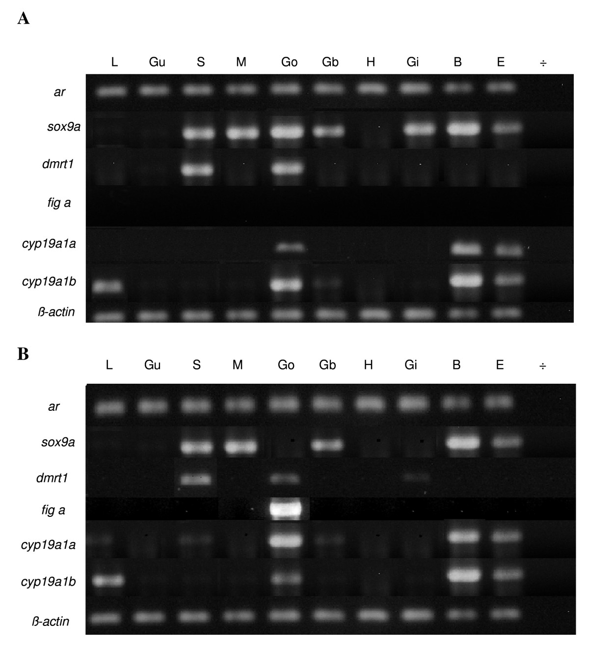 Fig. 8 Tissue specific expression of ar, sox9a, dmrt1, fig α, cyp19a1a and cyp19a1b in adult zebrafish.A Tissue from male zebrafish. B Tissue from female zebrafish. L: liver, Gu: gut, S: spleen, M: muscle, Go: gonad, Gb: gall bladder, H: heart, Gi: gills, B: brain, E: eye, ÷: no DNA (water control).