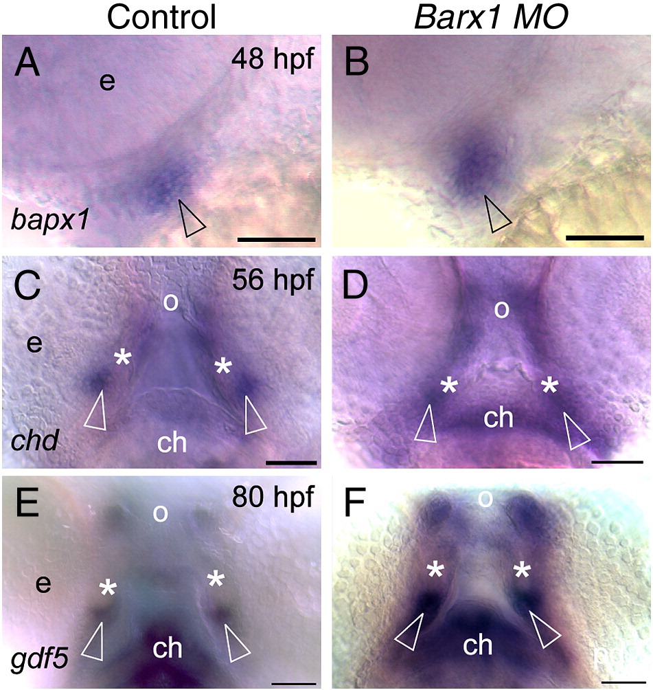 Fig. 6 Loss of barx1 enhances chordin and gdf5 expression in the jaw joint. Whole-mount in situ hybridization for (A, B) bapx1, (C, D) chordin (chd), and (E, F) gdf5. (A, C, E) Control uninjected embryos; (B, D, F) barx1 morphants (see Fig. 4). Embryonic ages as indicated. (A, B) Lateral view, anterior to the left. (C–F) Ventral view, anterior at the top; asterisk indicates Meckel's cartilage, open arrowheads indicate jaw joint expression domains; e, eye; ch, ceratohyal; o orifice. Scale bar: (A–F) 50 μm.