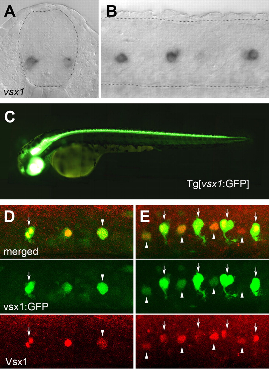 Fig. 1 vsx1 mRNA and vsx1:GFP expression in spinal cord. (A,B) vsx1 mRNA expression in 22 hpf embryos. Broken lines outline the boundary of the spinal cord. (A) Cross-section. (B) Lateral view of a whole mount. (C) Tg[vsx1:GFP] fish at 2.5 dpf. (D,E) Expression of GFP and Vsx1 in Tg[vsx1:GFP] embryos at (D) 17 hpf and (E) 19 hpf. Arrows indicate pairs of labeled cells. Arrowheads indicate single labeled cells.