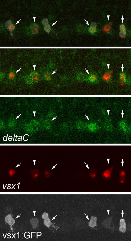Fig. S4 deltaC expression is upregulated in V2a neurons. Triple staining of deltaC mRNA (green), vsx1 mRNA (red) and GFP protein (white) in a Tgvsx1:GFP embryo at 19 hpf. The top panel shows a merged image of the three signals. The second panel from the top shows a merged image of the green and red channels. deltaC mRNA expression is present in p2 intermediate progenitors (arrowheads). In pairs of vsx1-GFP cells, strong deltaC expression is seen in only one of the cells (arrows). These cells also express vsx1. Thus, in a pair of vsx1-GFP cells, deltaC is likely to be upregulated in a cell that will ultimately differentiate into a V2a neuron.