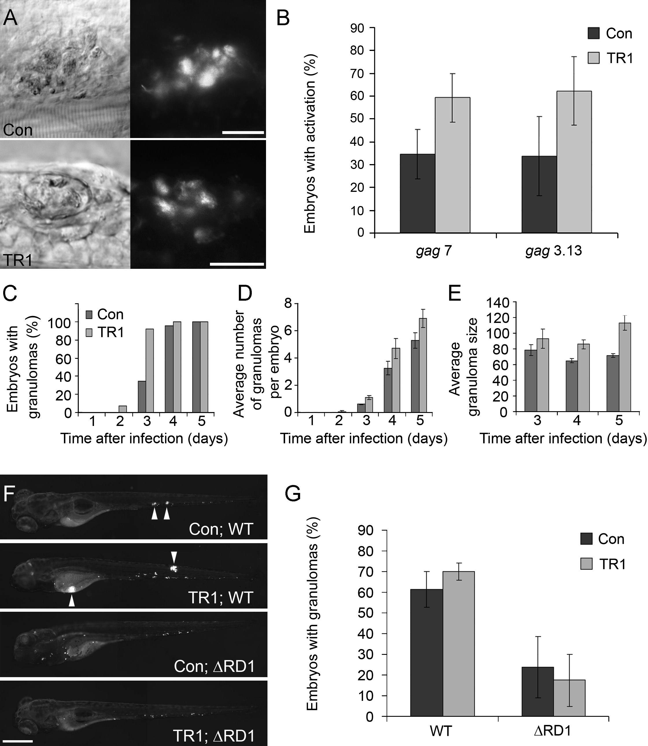 (F and G) Pools of 20 embryos were injected with 27 ± 6 wild-type (WT) and 51 ± 13 ΔRD1 M. marinum and assayed by microscopy at 4 dpi for granuloma formation. (F) shows representative images of control and TR1 morphant embryos. Arrowheads indicate granulomas. The scale bar represents 200 μm. As shown in (G), the average percentage of embryos with granulomas is plotted ± standard deviation of the mean over four biological replicates. The percentage of embryos with granulomas is significantly higher when injected with WT (p < 0.01 for Con; WT versus Con; ΔRD1 and p < 0.001 for TR1; WT versus TR1; ΔRD1 by Student's unpaired t test).