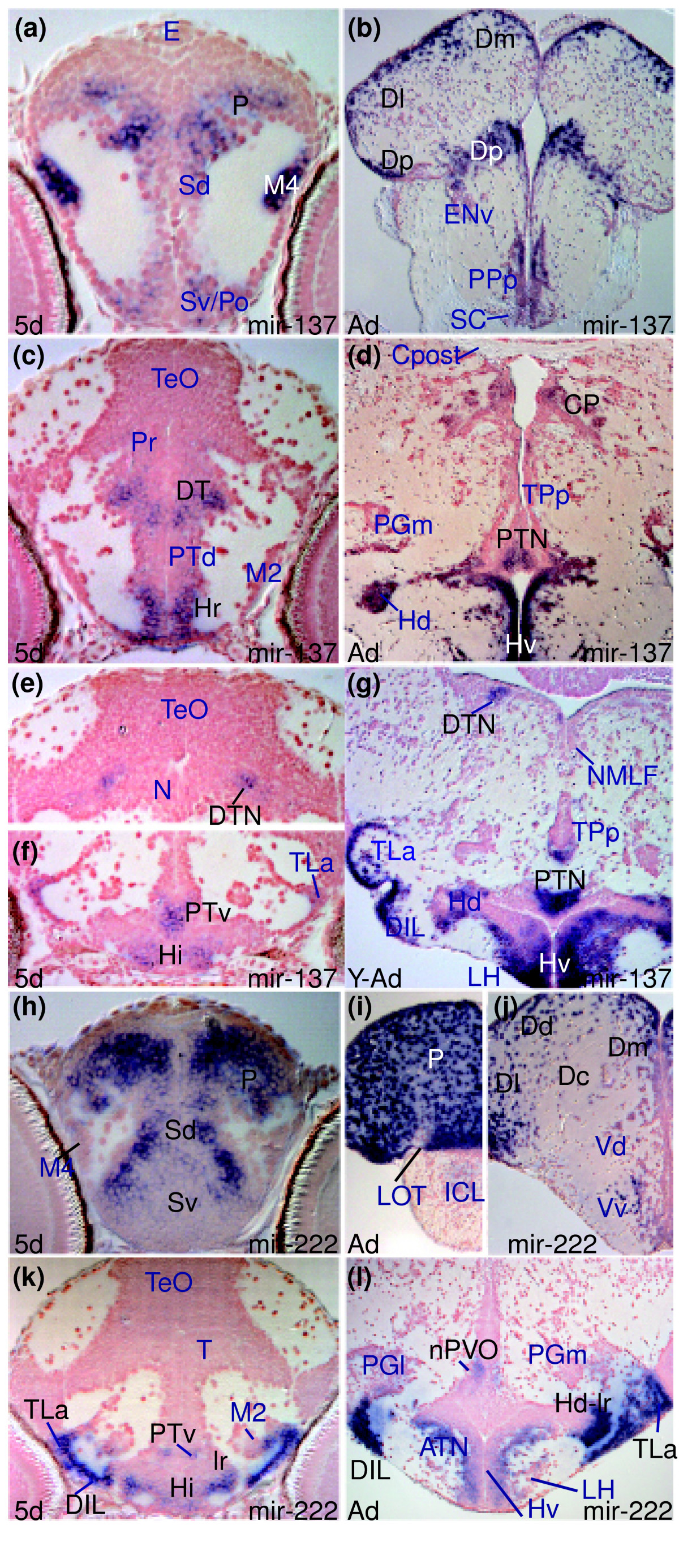 Fig. 3 miR-137 and miR-222 expression is conserved between larval and adult brain. (a,c,e,f) miR-137 expression in the larval caudal telencephalon (a), diencephalon (c), dorsal midbrain (e) and hypothalamus (f). (b,d,g) miR-137 expression in adult brain sections at levels corresponding to the embryonic sections shown in (a), (c) and (e/f), respectively. (h,k) miR-222 expression in the larval telencephalic pallium (P) and subpallium (Sd, Sv), hypothalamus (Hi, TLa, DIL, lr) and posterior tuberculum (PTv, M2). (i,j,l) miR-222 expression in corresponding adult nuclei in the pallium (P, Dm, Dl, Dd, Dc), subpallium (Vd, Vv), hypothalamus (ATN, LH, TLa, DIL, Hd-lr) and posterior tuberculum (nPVO, PGl).