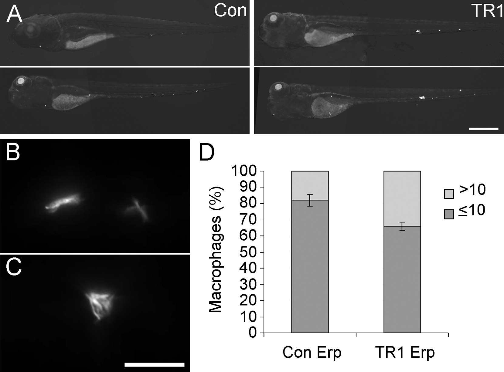 (A) Representative fluorescence images for control (Con) and TR1 morphant fish infected with 55 ± 7 CFU of Erp mutant (Erp) M. marinum at 4 dpi. The scale bar represents 500 μm.