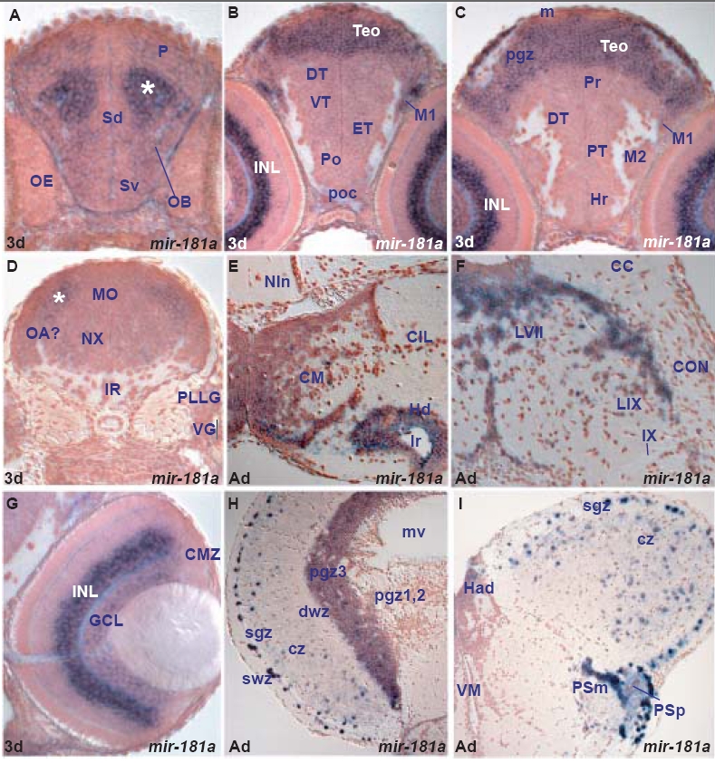 In the larval brain, miR-181a and miR-181b are strongly expressed in retinal ganglion and inner cell layers, migrated pretectal, and tectal cells, that is, cells associated with vision. There are two more areas with strong miR-181a and miR-181b expression, a group of cells located in the central part of the pallium, close to the olfactory bulb and dorsal subpallium, and one in the central medulla oblongata whereas the rest of the larval brain contains weakly expressing cells. Given the adult expression in the olfactory bulb and facial and vagal lobes, the strong telencephalic and medulla oblongata larval expression may correspond to cells that populate these areas. While comparing the regional expression of miR-181a and miR-181b, significant regional differences are not obvious at larval stages (Table C).