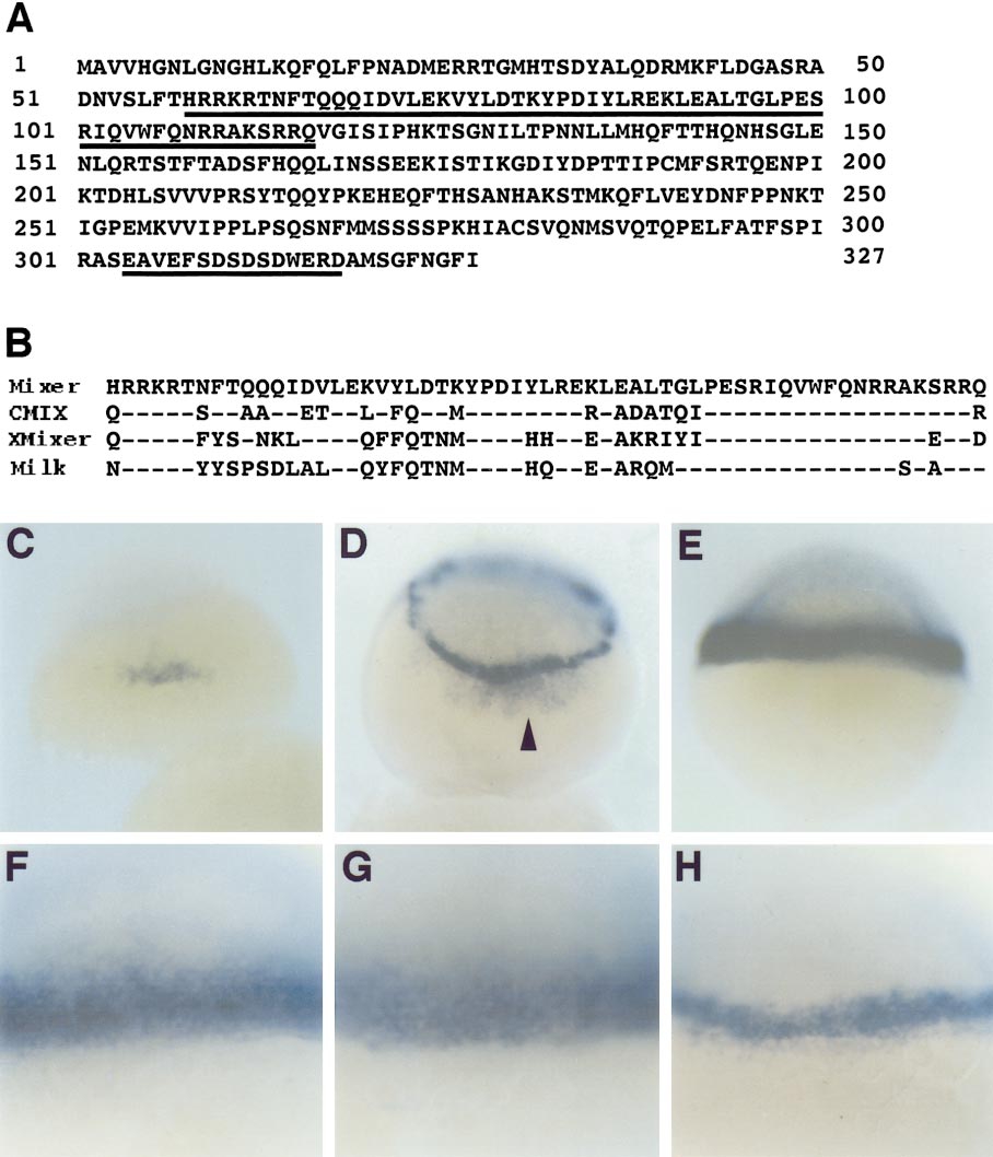 Fig. 5 Sequence and expression of a zebrafish Mixer homologue. (A) Predicted amino acid sequence of zebrafish Mixer; the homeodomain and a C-terminal acidic domain are underlined. (B) Comparison of the homeodomains of zebrafish Mixer (Mixer), CMIX, Xenopus Mixer (XMixer), and Milk; dashes indicate conserved residues. Expression of mixer (C–F), ntl (G), and gata5 (H) in wild-type embryos at sphere (C), dome (D), and 50% epiboly (E–H) stages. mixer expression initiates in a group of cells at the dorsal margin (C), then spreads throughout the marginal zone (D) where it is maintained at the onset of gastrulation (E). mixer also appears to be expressed in the dorsal YSL at dome stage (arrowhead in D). ntl expression (G) at the onset of gastrulation encompasses essentially the same cells as does mixer expression (F), while gata5 expression (H) is limited to a subset of these cells (compare F–H). (C, D) Dorsal views; (E–H) lateral views. (F–H) High-magnification Nomarski optics images.