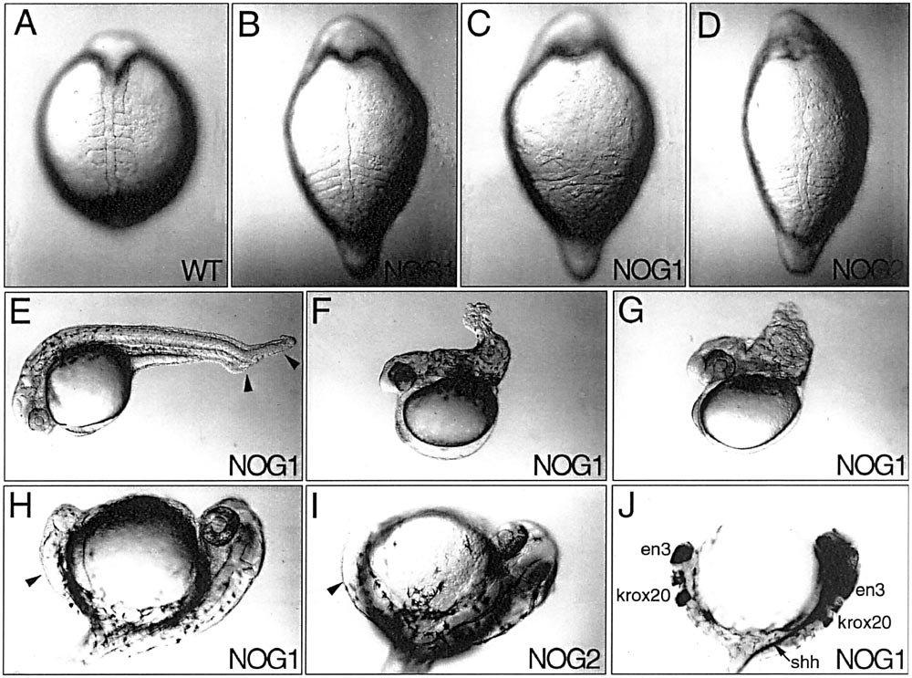 Fig. 6 Overexpression of zebrafish noggin genes dorsalizes the embryo and induces the formation of a partial secondary axis. (A–D) 5-somite-stage embryos. (A, B, D) Dorsal view. (C) Ventral view. Compared to uninjected control embryos (A), embryos injected with 20 pg mRNA encoding nog1 (B) or nog2 (D) are ovoid and display enlarged somites. (C) In severely affected embryos the somites are fused on the ventral side. (E–G) Lateral view of 36-h-old embryos injected with 4 (E) or 10 pg (F, G) nog1 mRNA. Injection of increasing amounts of noggin leads to posterior truncations of increasing severity. (H–J) Localized misexpression of nog1 or nog2 in one blastomere at the 16-cell stage induces the formation of a partial secondary axis (arrowhead). (J) The secondary axis comprises rhombomeres 3 and 5 stained by krox20 and the midbrain–hindbrain boundary visualized by en3 expression but lacks a sonic hedgehog-expressing floor plate, which is present only in the primary axis (arrow).