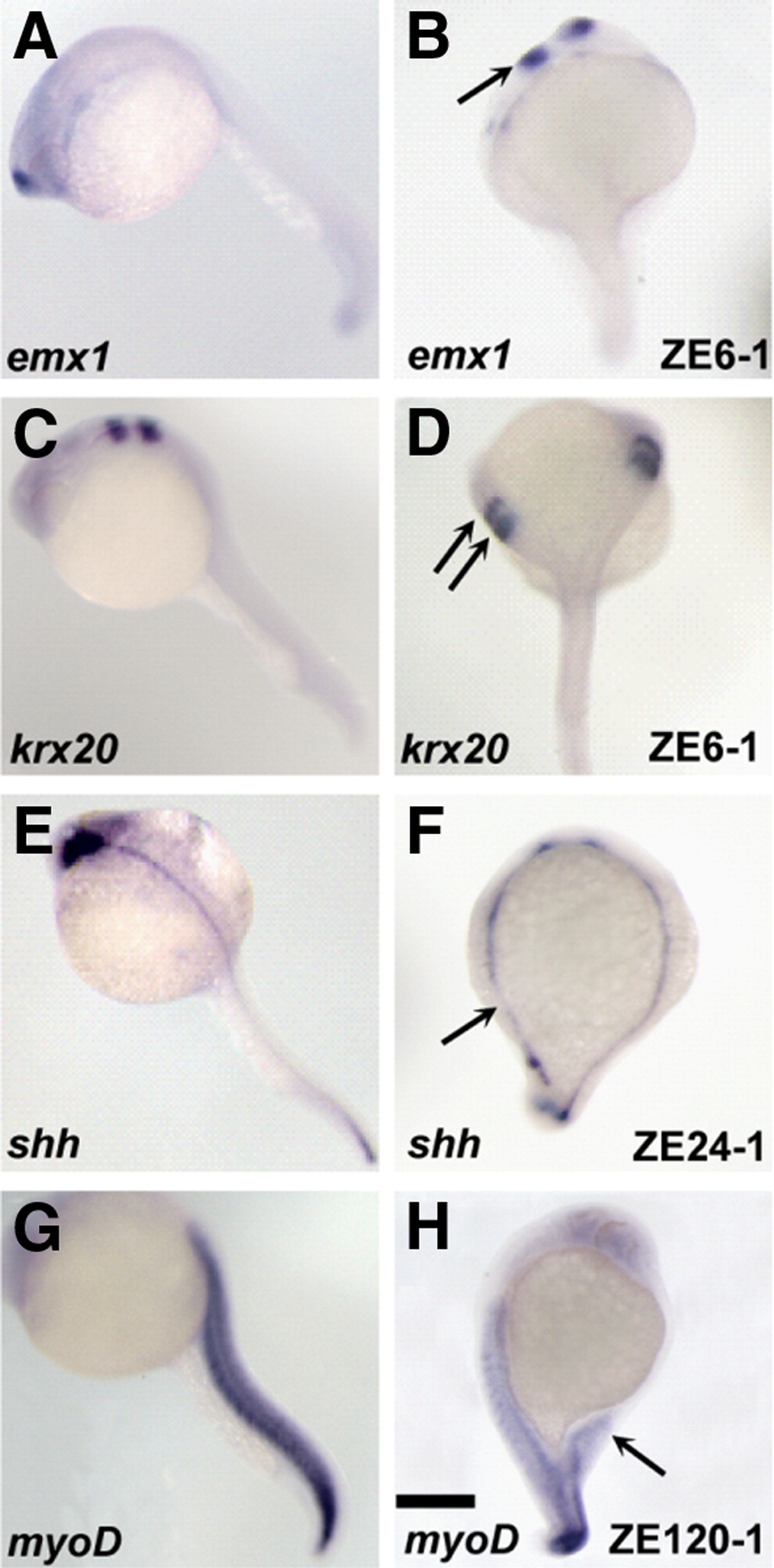 Fig. 1 Expression of specific marker genes in the secondary axis. (A, B) Dorsal telencephalic marker gene emx1. (C, D) Rhombomere 3 and 5 marker gene krx20. (E, F) Floor plate marker gene shh. (G, H) Somite marker gene myoD. (A, C, E, G) Control, non-implanted embryos. (B, D, F, H) cell-implanted embryos. The secondary axis had a visible notochord. (A–C, F–H) Lateral views. (D, E) Dorsal views. All embryos are at the pharyngula stage (24 hpf). Arrows indicate the ectopic expression of the marker gene inthe secondary axis. Scale bar, 100 μm.