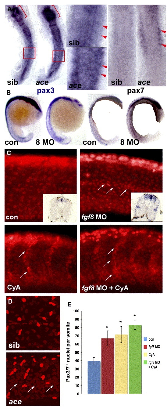 Fig. 5 Fgf8 signalling negatively regulates pax3/7 expression. In situ mRNA hybridisation for pax3, pax7 or immunodetection of Pax3/7 in ace mutants or embryos injected with fgf8 MO or vehicle, followed by treatment with cyclopamine or vehicle and analyzed at 15 s (A, dorsal flatmount anterior to top), 18 s (B, lateral wholemount dorsal to left), 24 hpf (C) or 26 hpf (D, lateral confocal stacks of midbody somites, dorsal to top, anterior to left). (A) Both pax3 and pax7 mRNA are up-regulated in ace mutants, which were identified by their midhindbrain pattern defects (brackets). Note pax3/7 increase in the anterior of somites (arrowheads, boxes are enlarged), relative to neural tube. (B) Pax3 and pax7 up-regulation in all somites after fgf8 MO injection. (C) Pax3/7-containing nuclei are increased in number by fgf8 MO, cyclopamine or both. Fgf8 MO particularly increases staining at the horizontal myoseptum, in contrast to cyclopamine which increases cells on the somite borders (arrows). Note the lack of change in intensity of immunofluorescence and the lack of significant neural crest migration in both control and treated posterior somites. Insets show pax3 mRNA up-regulation persisting to 33 hpf. (D) Ace mutant embryos (identified by cerebellar morphology) have more weak Pax3/7 immunoreactive nuclei than siblings. Note clustering around the horizontal myoseptum (arrows) and more extensive neural crest migration in these older embryos compared to panel C. (E) Quantification of Pax3/7-expressing cells per somite after treatments indicated. Data represent mean ± standard deviation of counts from four somites in at least 4–7 embryos. Asterisks indicate significant difference from control, P < 0.001.