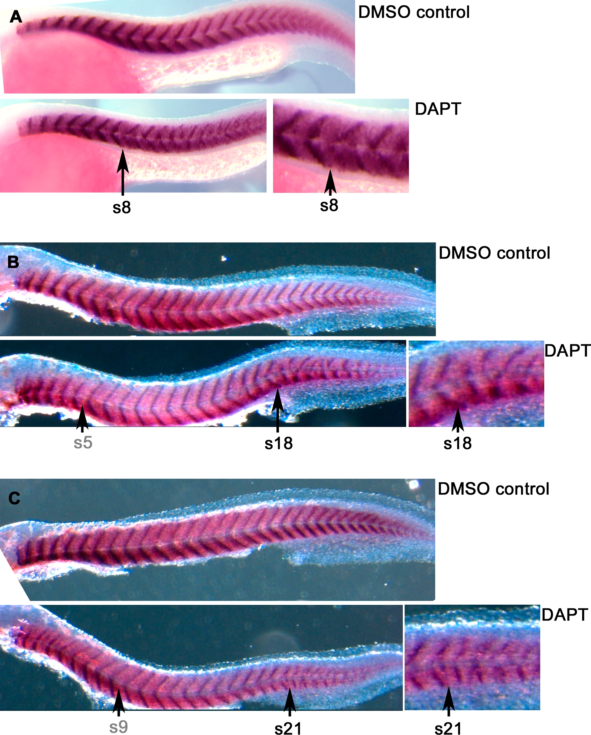 Embryos were treated with 100 μm DAPT or with DMSO (control) medium and stained by ISH for titin at the end of somitogenesis to reveal somite boundaries. Treatment was begun (A) at 3 hpf, (B) at 5-somite stage, or (C) at 9-somite stage. Arrows with grey labels indicate stage at onset of DAPT treament; arrows with black labels indicate the level of the earliest defective somite. A detailed view of the region where disruption begins is shown to the right of each DAPT specimen.