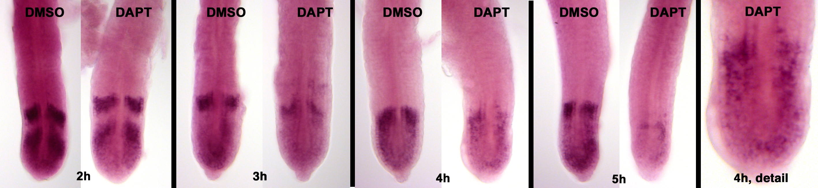 Wild-type embryos were treated with 100 μm DAPT or with DMSO (control) medium and stained by ISH for her1 for 2, 3, 4, or 5 h, as indicated. The rightmost panel is a detail of the 4-h specimen, showing the chaotic pattern of expression of her1. Treatment was begun at the 16-somite stage. For each case, at least 14 embryos were examined, and typical specimens were selected for this illustration.