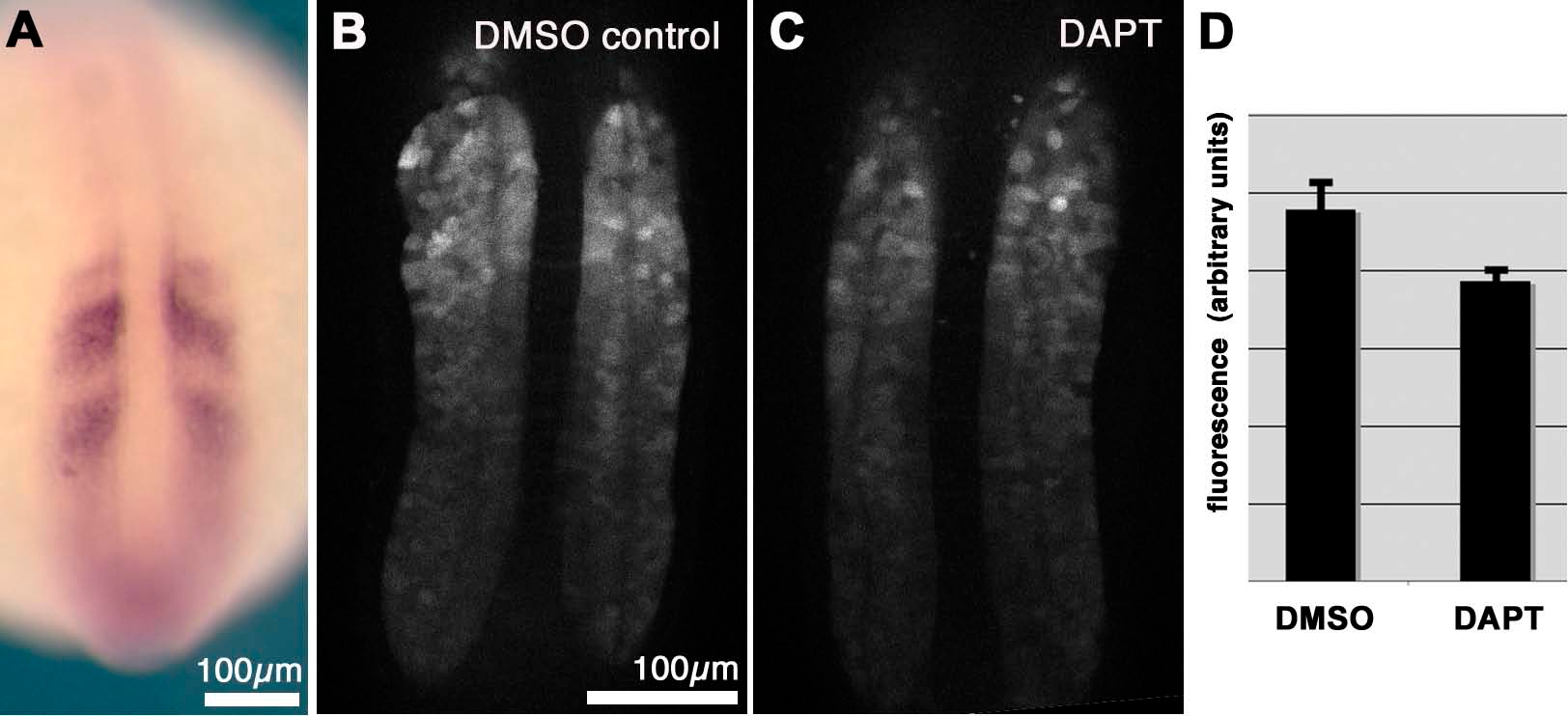 (C) Corresponding embryo treated with DAPT and imaged in the same way as in (B).