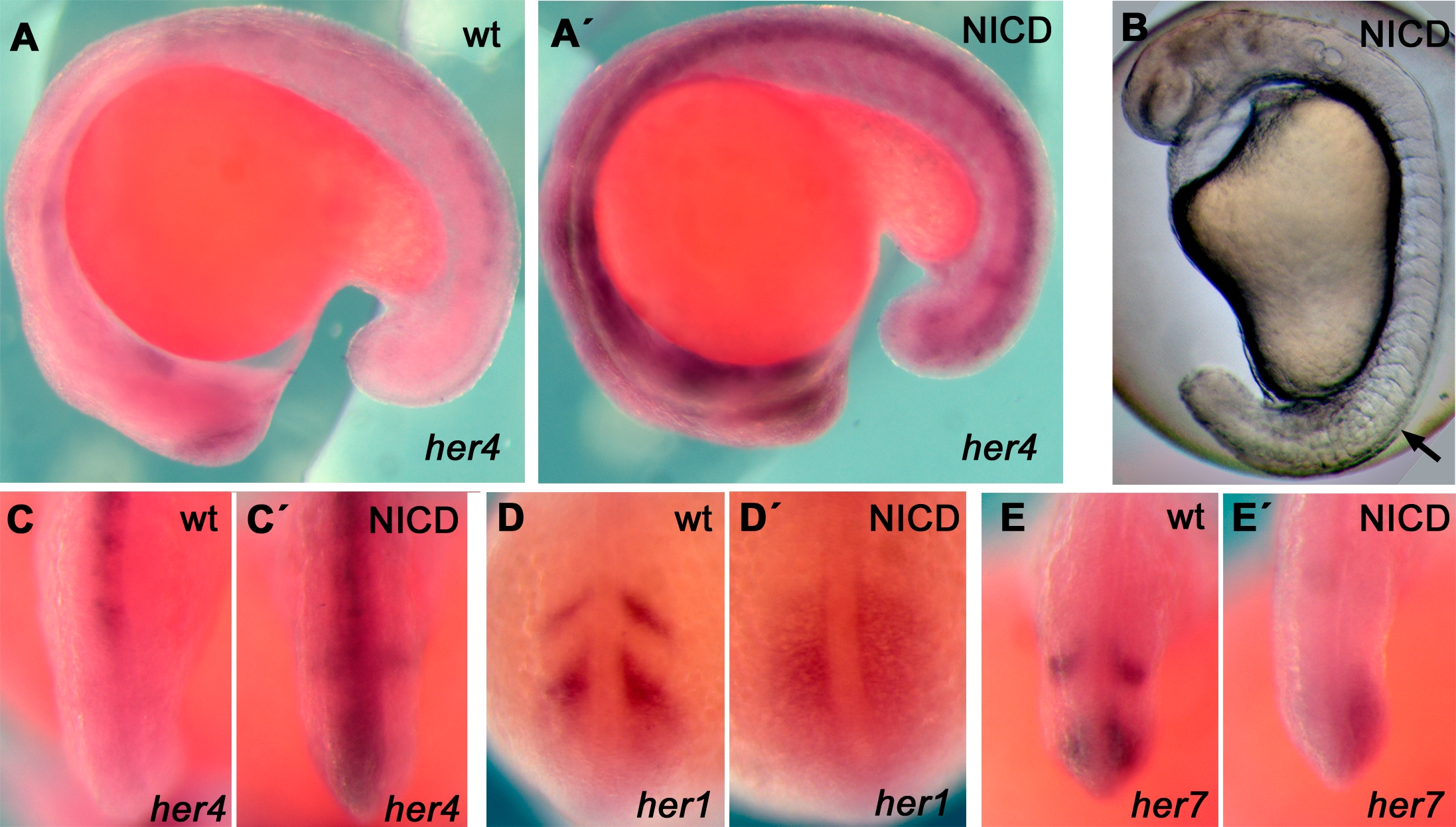 (A,A′) One hour after the end of a heat shock (delivered at the 16-somite stage), her4 expression is strongly induced in the neural tube and other tissues, including the PSM (C,C′).