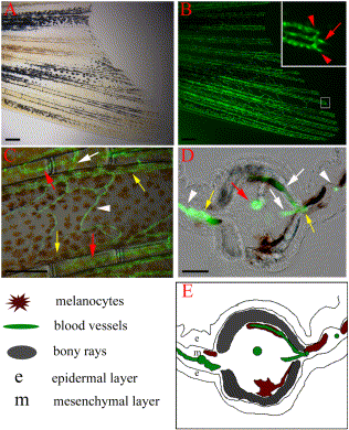 Fig. 1 Vasculature of the zebrafish caudal fin. TG(fli1:EGFP)y1 fish express EGFP in blood vessel endothelial cells. (A) Bright field image of the ventral half of the caudal fin of an adult TG(fli1:EGFP)y1 fish and (B) epiflourescence image of the same fin, revealing the vasculature. (Inset) Higher magnification of the distal end of a fin ray (boxed region) shows that each fin ray is associated with one artery (red arrow) in the center of the ray and two veins (red arrows) adjacent to the bony ray. (C) High magnification image shows the intervessel commissures within the same ray (white arrow), which connect artery to vein as well as vein to vein. The interray vessels (white arrowhead) connect vein to vein of adjacent rays. (D, E) Cross-section through a fin ray shows the artery in the center of intraray mesenchyme (red arrow), while the veins are in interray mesenchyme adjacent to the bony rays (yellow arrows). Intervessel commissures (white arrows) and interray vessels (white arrowheads) are also visible in this section. Explanatory diagram is shown in (E). Scale bars, 200 μm in (A, B, C), 20 μm in (D).