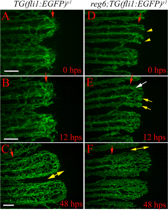 Fig. 7 Temperature down-shift experiments show that anastomosis can be delayed with no apparent consequence to the plexus formation. While wild-type fish (A–C) always complete anastomosis successfully and develop normal plexuses in these experiments, most regenerating vessels in reg6 mutants (D–F) had failed to complete formation of anastomotic bridges (D) at the time of shift (26 hpa) (yellow arrowheads point out the absence of anastomotic bridge at amputation plane; also see Table 1). (E) Although the vessels developed small bulbs at the distal ends (yellow arrows), they were able to form anastomotic bridges at a more distal position (white arrow) 12 hps. (F) These vessels developed normal plexuses within 2 days after shift to the permissive temperature. hps, h postshift. Red arrow, amputation plane; yellow arrow, swollen vessels; double-headed arrow, plexus. Scale bar, 100 μm.