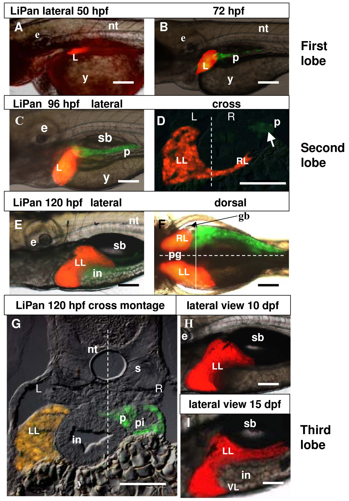 Fig. 1 Liver development in LiPan transgenic zebrafish. (A, B) Initial RFP expression in the liver starts at 48–53 hpf (A) and GFP expression in the exocrine pancreas starts at 67–72 hpf (B). (C) Expression of RFP and GFP at 96 hpf. (D) Cross section of a 96 hpf larvae shows RFP-positive liver. GFP-expressing exocrine pancreas is faintly visible (arrow). The dotted line represents the midline of the larva and left (L) and right (R) sides are indicated. (E, F) Expression of RFP and GFP in the larva at 120 hpf: lateral (E) and dorsal view (F). The dotted horizontal line in (F) represents the midline with the right side at the top. The solid vertical line represents the plan of the cross section in (G). (G) A cross section to illustrate morphology of internal organs and expression of transgenes right (R) sides are indicated. (H, I) Lateral view of RFP-expressing liver at 10 dpf (H) and in a 120-hpf larva. The dotted line represents the midline of the larva and left (L) and 15dpf (I). Abbreviations: e, eye; gb, gall bladder; in, intestine; L, liver; LL, left lobe; RL, right lobe; nt, notochord; p, pancreas; pi, principal islet; pg, pigment; s, somite, VL, ventral lobe. In all whole mount images anterior is towards the left. Scale bars, 125 μm.