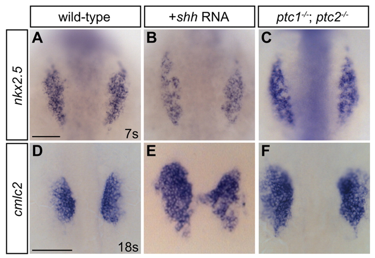 Fig. 3 Increased Hedgehog signaling expands cardiomyocyte numbers. (A-F) Dorsal views, anterior towards the top. Scale bars: 100 μm. (A-C) nkx2.5 expression at the seven-somite stage is subtly expanded in shh-injected and ptc1;ptc2 double mutant embryos. The observed extent of anterior-posterior enlargement was variable. (D-F) cmlc2 expression at the 18-somite stage is expanded in shh-injected and ptc1;ptc2 double mutant embryos. The degree of expansion was variable and frequently coupled with disorganized morphology of migrating cardiomyocyte populations, as in E.
