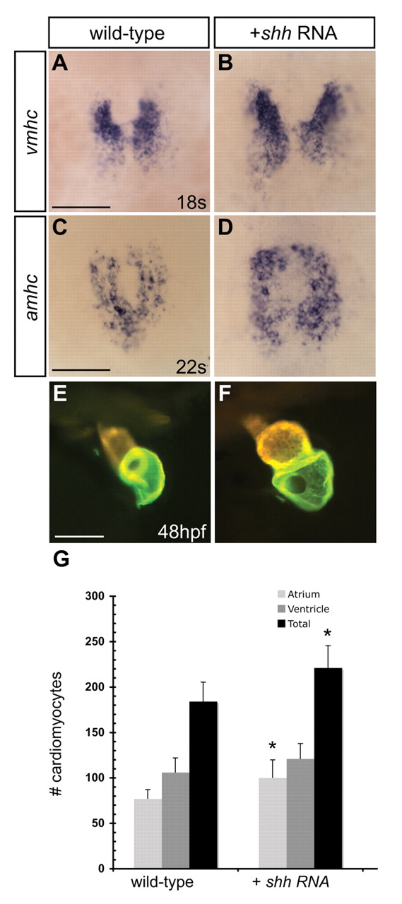 Fig. 4 Increased Hh signaling expands ventricular and atrial populations. (A-D) Dorsal views, anterior towards the top. (A,B) vmhc expression at the 18-somite stage and (C,D) amhc expression at the 22-somite stage are expanded in shh-injected embryos. (E,F) At 48 hpf, shh-injected embryos often exhibit enlarged hearts, as indicated by MF20/S46 immunofluorescence. Scale bars: 100 μm. (G) Quantification of cardiomyocyte number in wild-type and shh RNA-injected embryos at 52 hpf. Values represent the mean cell number for each category (±s.d.). Asterisks indicate statistically significant differences from wild type (P≤0.0005).