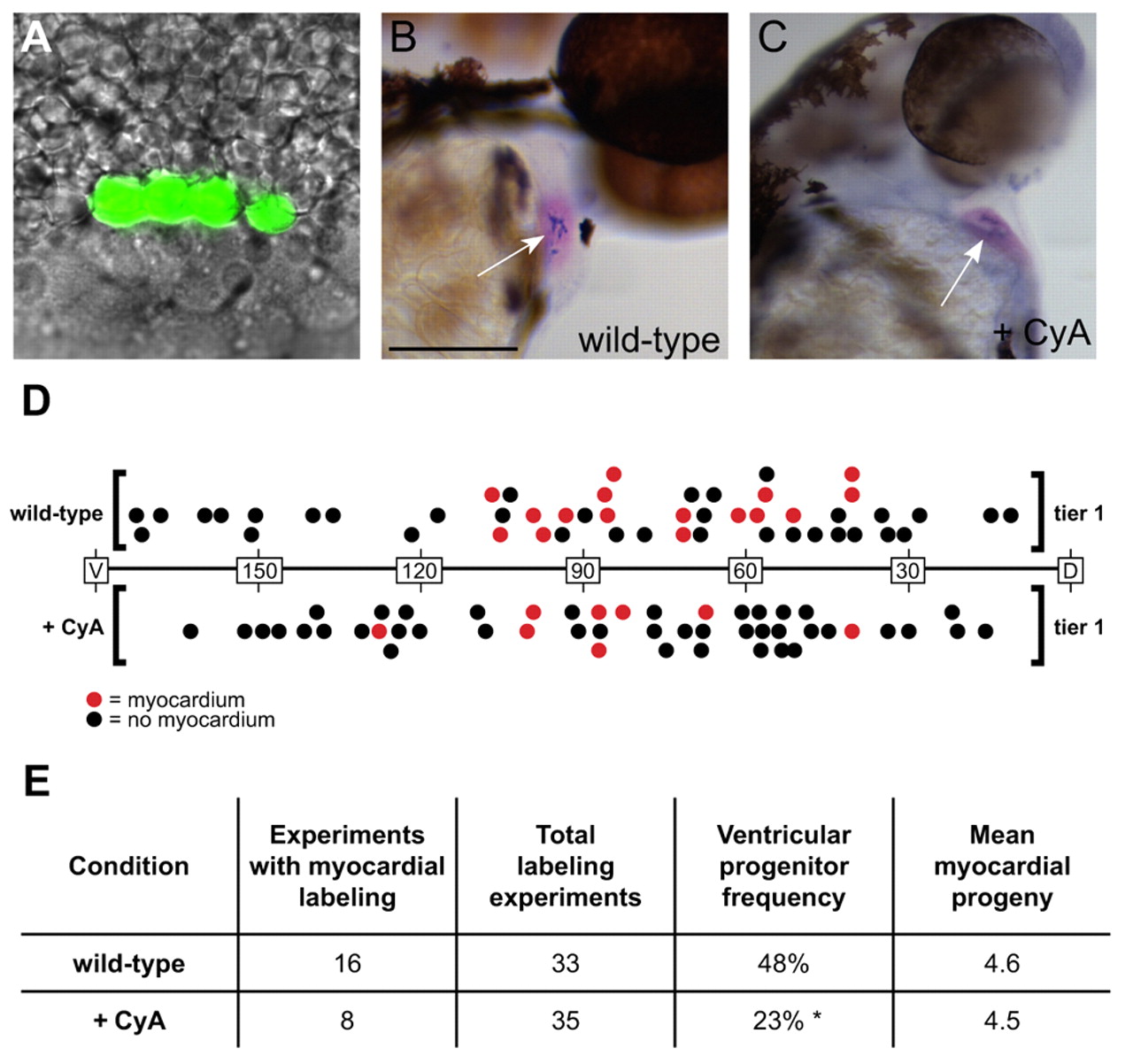 Fig. 6 Embryos with reduced Hedgehog signaling contain fewer myocardial progenitors. (A) Example of a 40% epiboly embryo in which four adjacent blastomeres in the first row above the embryonic margin (tier 1) were labeled by photoactivation of caged fluorescein-dextran. Fluorescein is pseudocolored in green and superimposed on a DIC image. (B,C) 48 hpf embryos with labeled contributions to ventricular myocardium. (B) Six labeled cardiomyocytes found within a wild-type ventricle. Scale bar: 100 μm. (C) Five labeled cardiomyocytes found within a CyA-treated ventricle. Myocardium is visualized via in situ hybridization for cmlc2 (pink) and labeled cells are marked in blue (arrows). (D) 40% epiboly myocardial fate maps of tier 1 blastomeres in wild-type and CyA-treated embryos. Wild-type fate map is shown above the horizontal axis and CyA-treated fate map is shown below the axis. Longitude coordinates of the margin are depicted with dorsal as the origin (0°) and ventral as 180°. Each circle represents an individual labeling experiment. Red circles represent experiments in which the labeled blastomeres contributed to ventricular myocardium, and black circles represent embryos in which the labeled cells did not become cardiomyocytes. The position of each circle indicates the median longitude value of the labeled blastomeres. Experiments from the left and right sides are merged for convenience of presentation. (E) Results from fate-mapping experiments conducted 50°-125° from dorsal, the region within tier 1 where ventricular myocardial progenitors are found. A ratio of the number of experiments yielding labeled ventricular myocardium to the total number of experiments was used to determine the ventricular progenitor frequency. Asterisk indicates a statistically significant difference from wild-type (P=0.0418, Fisher's exact test). The mean number of myocardial progeny per embryo was determined by counting labeled cardiomyocytes in relevant cases (see Table S5 in the supplementary material).