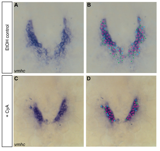 Fig. S1 Example of the cell counting technique used to quantify cardiomyocytes at 18-somite and 22-somite stages. (A-D) In situ hybridization detects vmhc expression at the 18-somite stage. Dorsal views, anterior towards the top. In cell counting experiments, the number of cardiomyocytes expressing the gene of interest is determined by marking each cell containing NBT/BCIP precipitate. (A,C) Individual cells are easily identified and quantified as the staining is excluded from the nucleus; nuclei are counted if surrounded by precipitate. (B,D) In these examples, the most intensely stained cells are marked with pink dots, the faintest cells are marked with green dots and the intermediate cells are marked with blue dots. All marked cells are included in the total cell count.