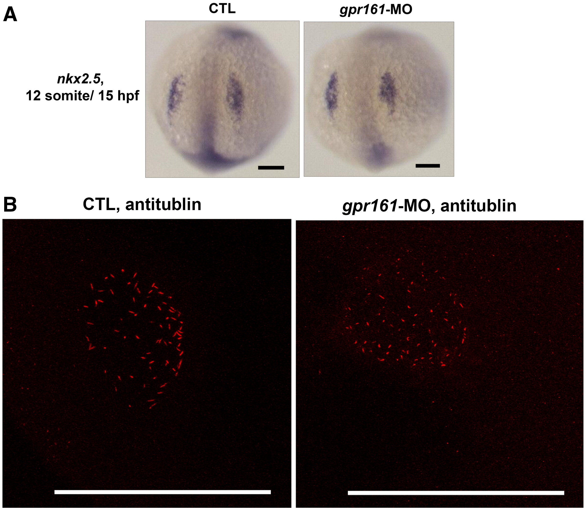 Fig. S4 (A) nkx2.5 expression in control and gpr161 knockdown embryos. (B) Confocal imaging of microcilia in Kupffer's vesicle. Anti-tubulin staining (red) of microcilia of control and gpr161 knockdown embryos in the Kupffer's vesicle at 14 hpf. All scale bars were 100 μm.