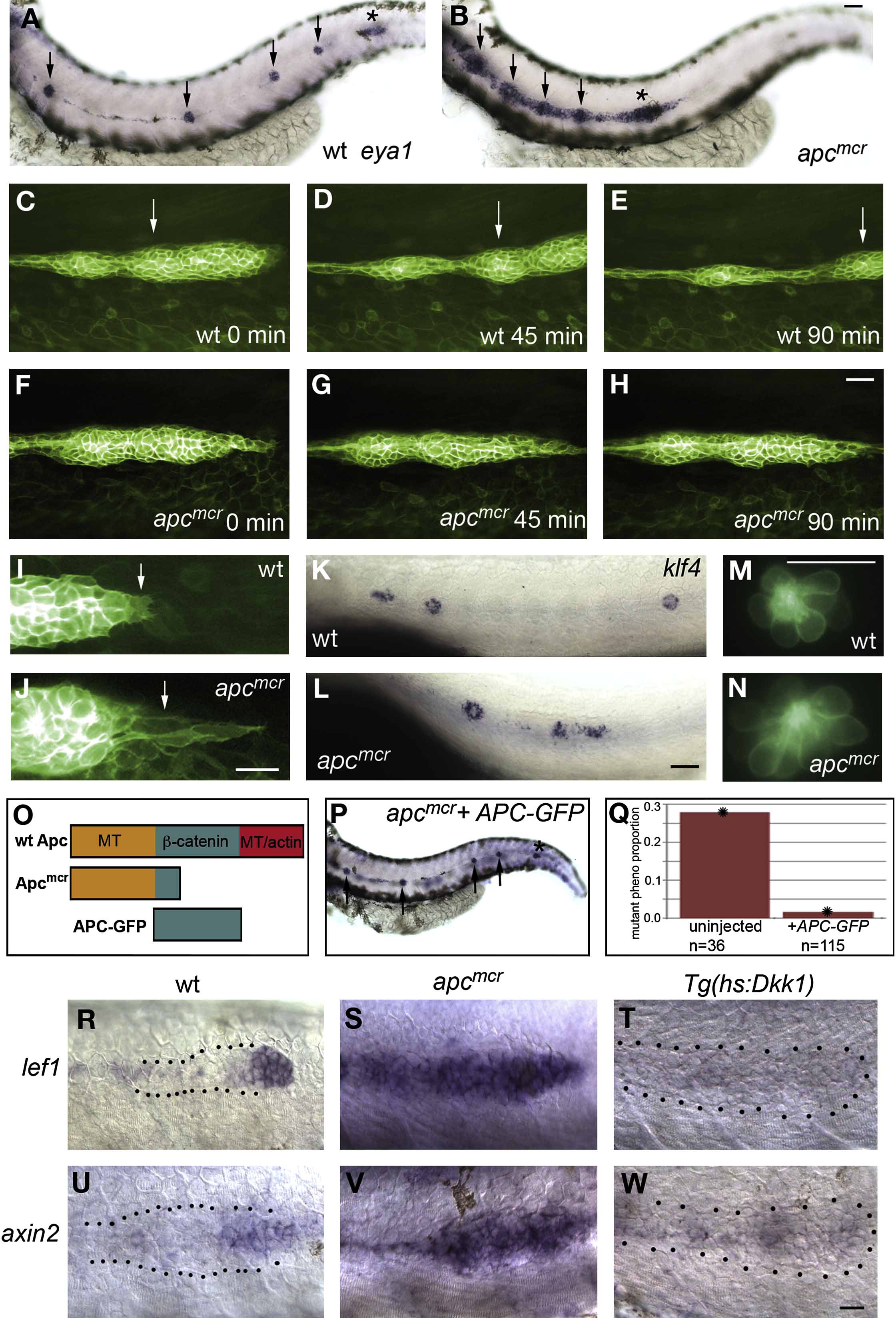 (P) An apcmcr embryo that was rescued by APC-GFP injection as revealed by eya1 in situ. Arrows indicate neuromasts; an asterisk labels the primordium.