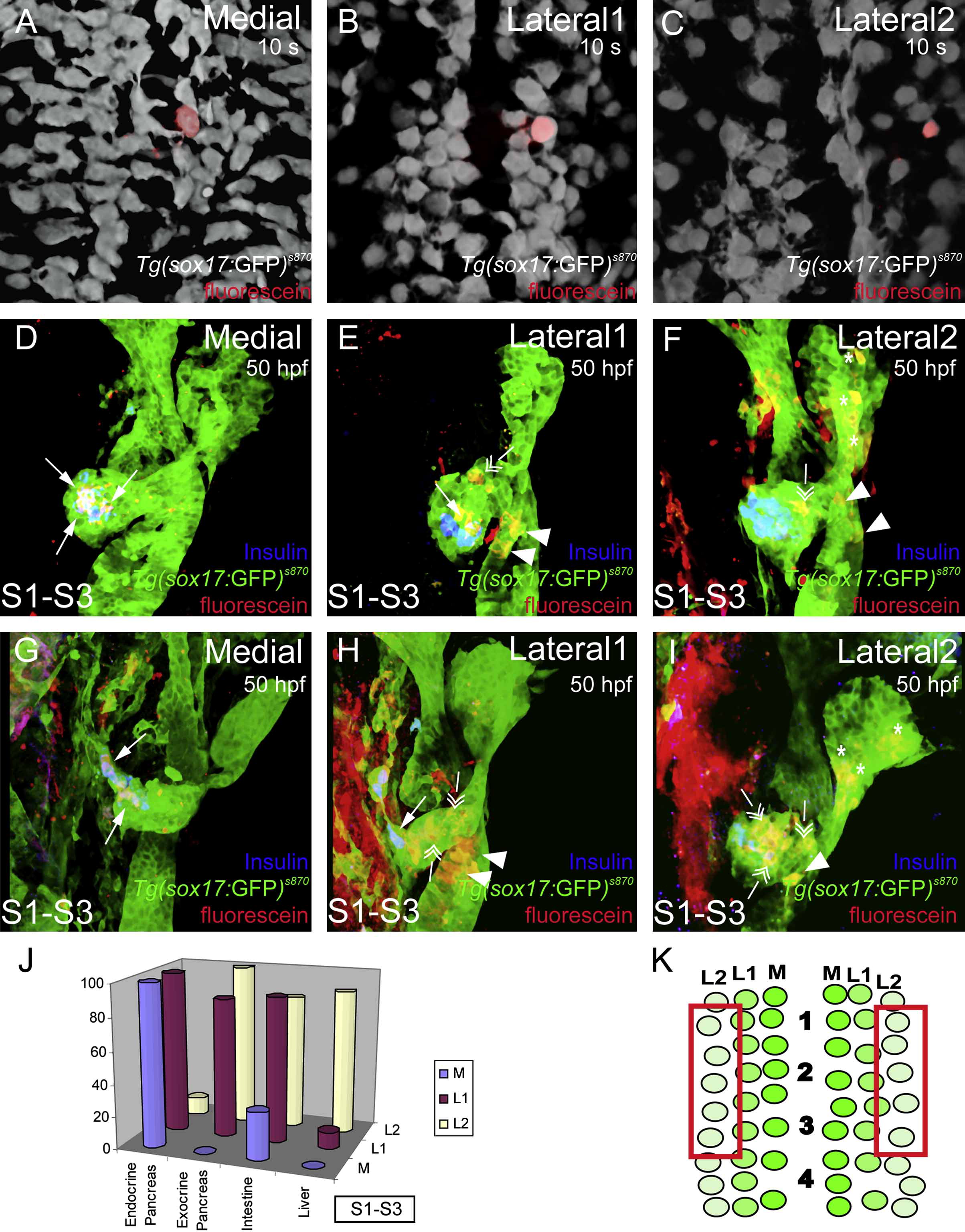 (D–I) Confocal projections of Tg(sox17:GFP)s870 embryos at 50 hpf showing the progeny of the medial (D and G), lateral 1 (E and H), and lateral 2 (F and I) cells. Tg(sox17:GFP)s870 embryos were stained for GFP (green), Insulin (blue), and uncaged fluorescein (red) (triple-positive cells appear white). Medial cells (D and G) mostly gave rise to pancreatic endocrine cells (arrows). Lateral 1 cells (E and H) gave rise to exocrine cells (double arrows), a small number of endocrine cells (arrows), as well as intestinal tissue (arrowheads) adjacent to the pancreas. Lateral 2 cells (F and I) gave rise to liver (asterisks), intestine (arrowheads), and exocrine cells (double arrows).