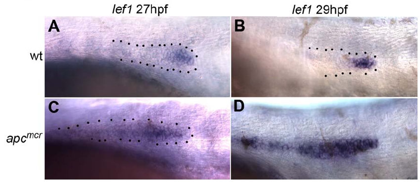 In wt primordia lef1 is restricted to the leading zone of the primordium at 27hpf (A) and 29hpf (B). In apcmcr mutant primordia lef1 is initially restricted from trailing cells at 27hpf (C) but is fully expanded into the trailing zone by 29hpf (D).