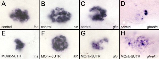 Fig. 6 The endocrine pancreas in nkx2.2a-morphant embryos. Ventral views. (A–C, E–G) 32 hpf. (D, H) 48 hpf. Pancreatic hormone expression in control embryos (A–D) and representative MOnk-5UTR injected embryos (E–H). (A, E) Insulin, (B, F) somatostatin, (C, G) glucagon, (D, H) ghrelin. Using ImageJ software we could calculate that insulin expression in panel E is 52% less than control (A), while glucagon expression in panel G is 43% less than control (H). In panel H, ghrelin expression levels are 60% more than control (D).